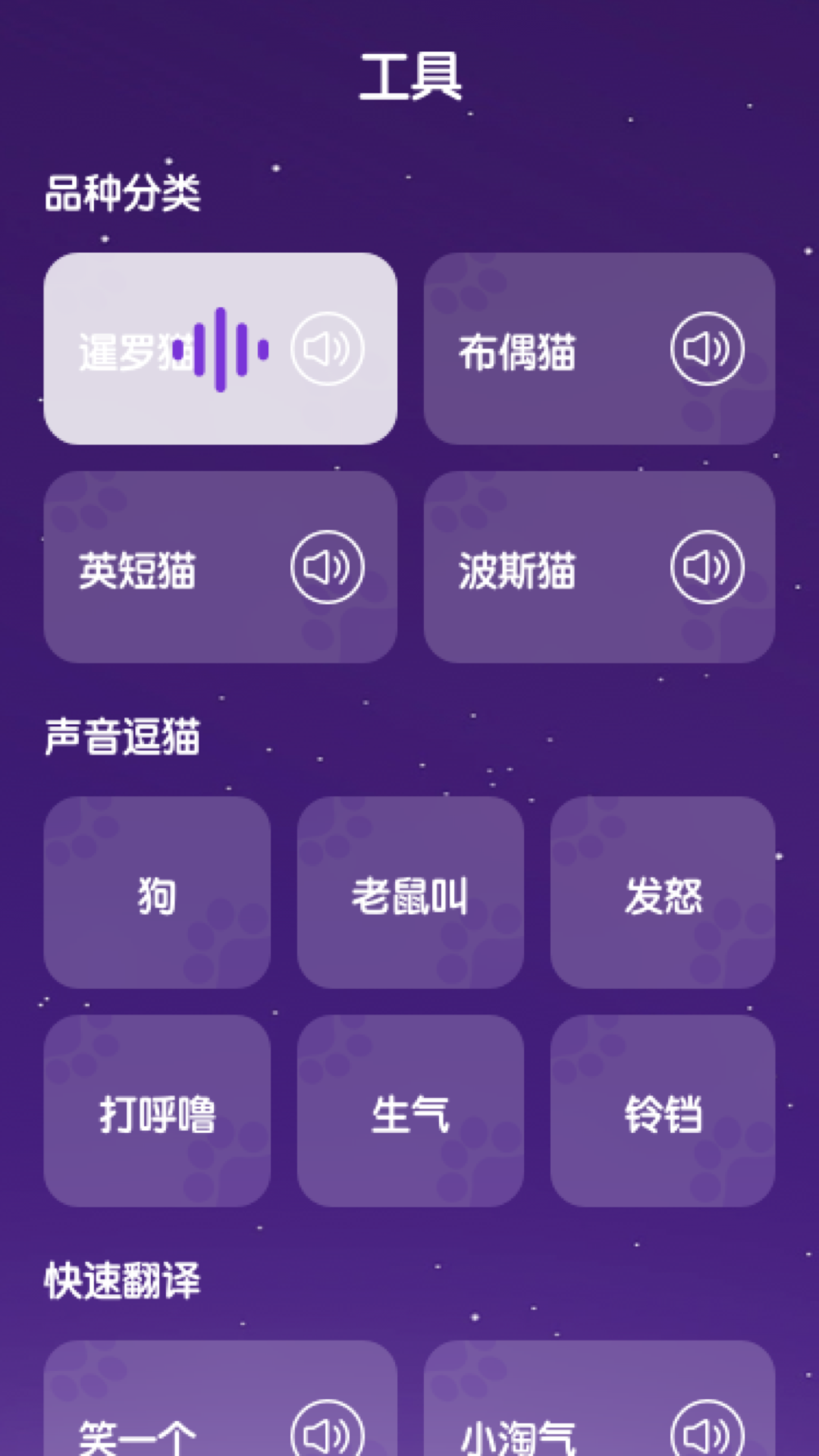 猫语页面中内置了猫咪翻译器,你可以借助它尝试解读猫咪内心的想法,这样就能进一步增进你和心爱的宠物之间的默契程度啦。工具页面则汇聚了多种多样的猫咪叫声,像暹罗猫、布偶猫、英短猫、波斯猫等不同品种猫咪的叫声应有尽有,同时还涵盖了猫咪发怒、生气等各种情绪状态下的叫声表达,能让你更加深入地了解猫咪。