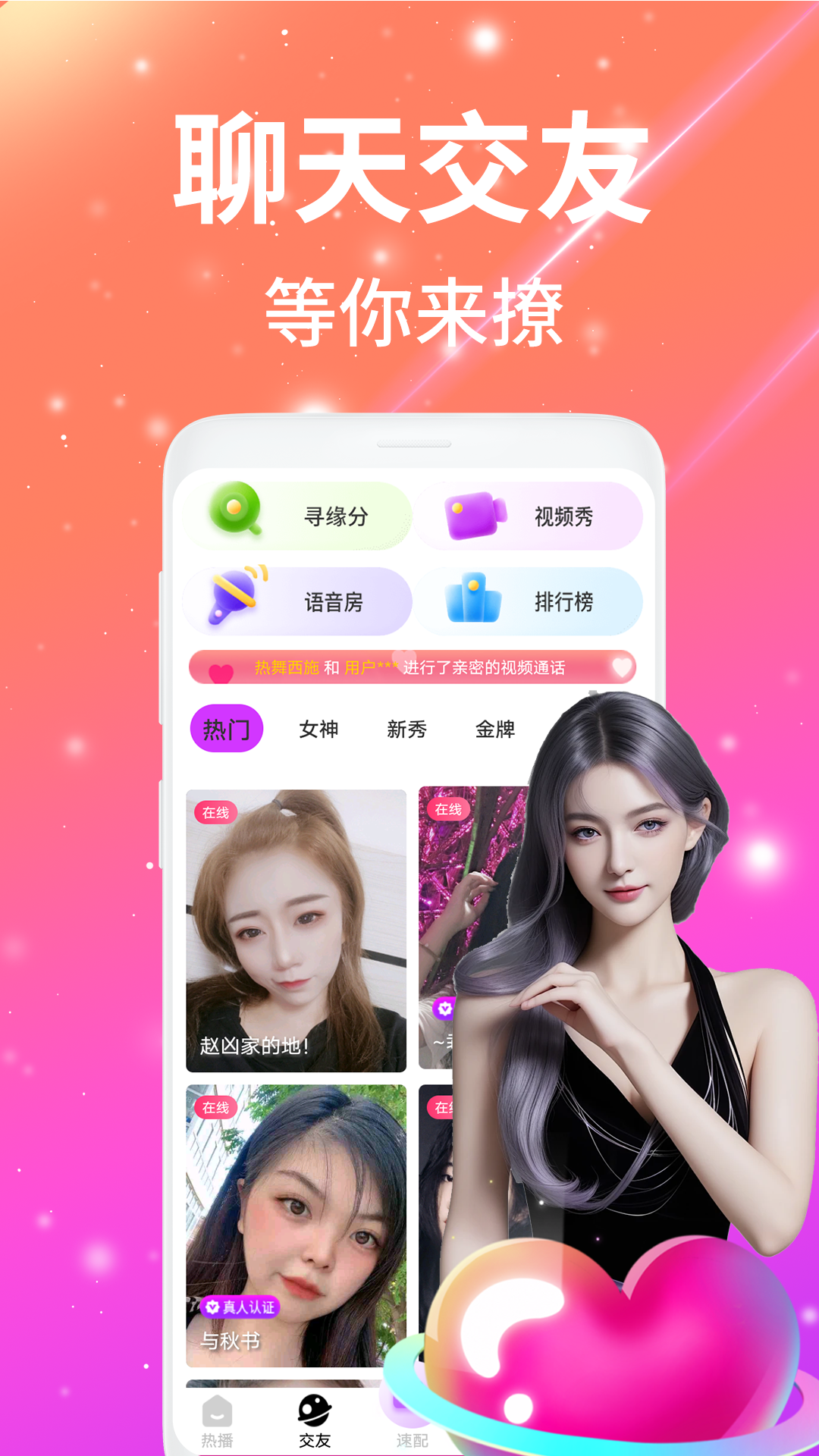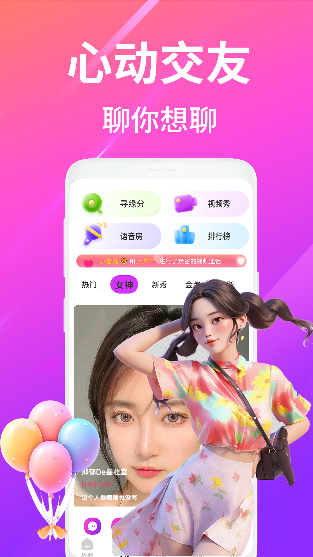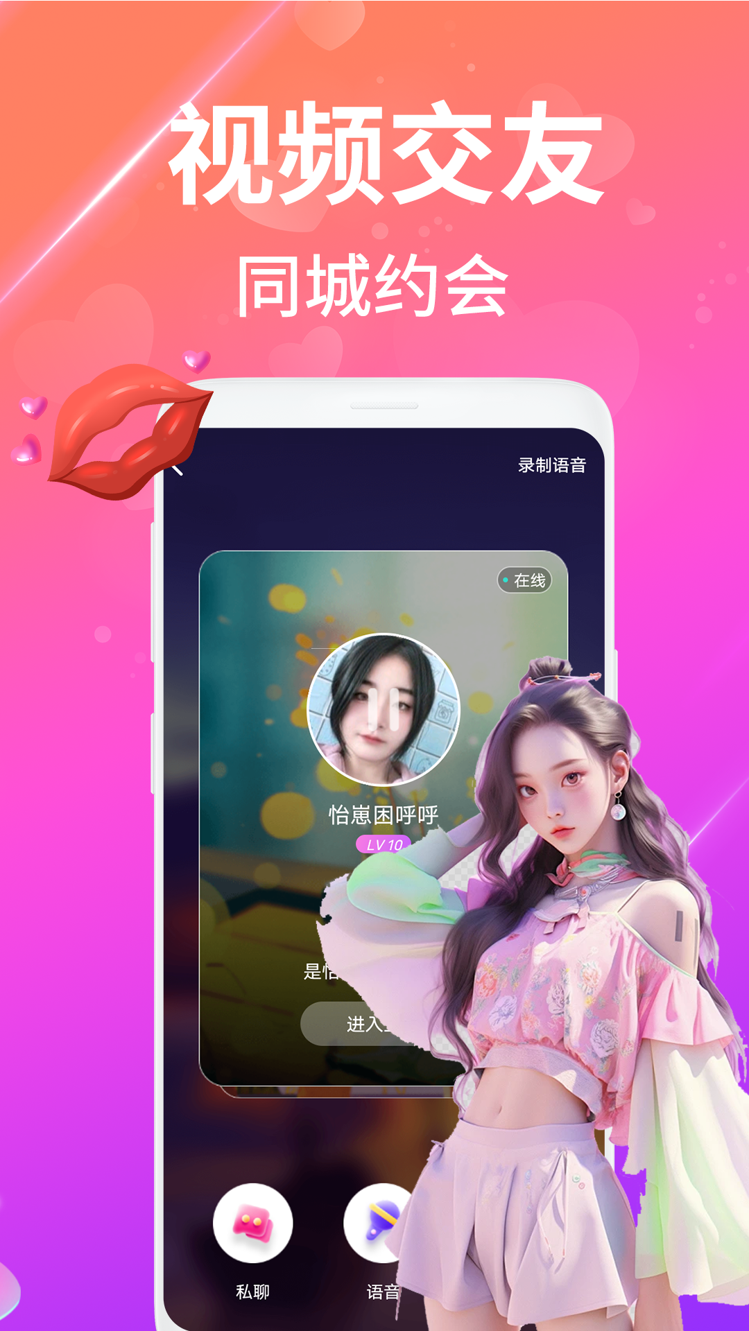 这个APP充满爱与活力,无论是热爱生活的你,还是单纯喜欢聊天的你,都能在这里找到乐趣。它提供多种有趣的社交玩法,比如视频聊天、匿名聊天、视频交友、组cp、处对象等。同时,你还能观看小姐姐的直播视频聊天,与同城附近的陌生单身男女开启附近约会之旅,从此告别孤独。