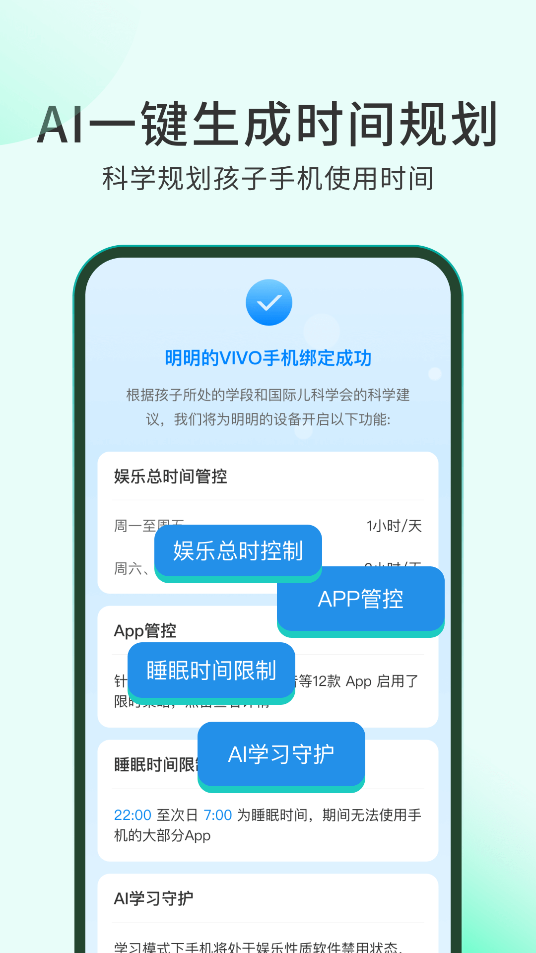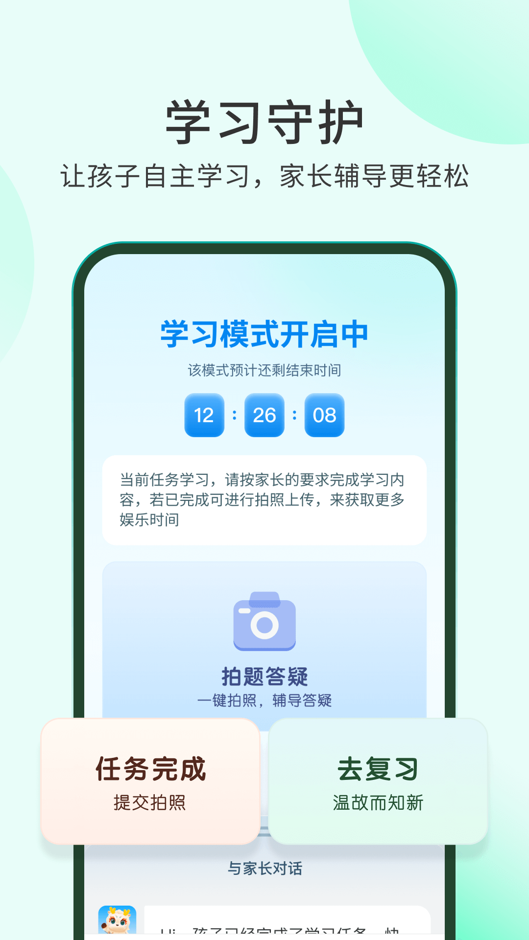 作为家长,还在对孩子沉迷上网和孩子学习无法帮助而烦恼吗?家庭守护联合权威教育专家,结合大数据教育模型,根据不同年龄段孩子制定手机使用、学习和睡眠时间建议。手机使用时,全程屏蔽不良信息,创造绿色上网环境;学习任务完成后,我们将提供上亿题库供孩子拍照搜题,进行自我学习和批改。不要犹豫,快去为孩子制定专属方案吧。