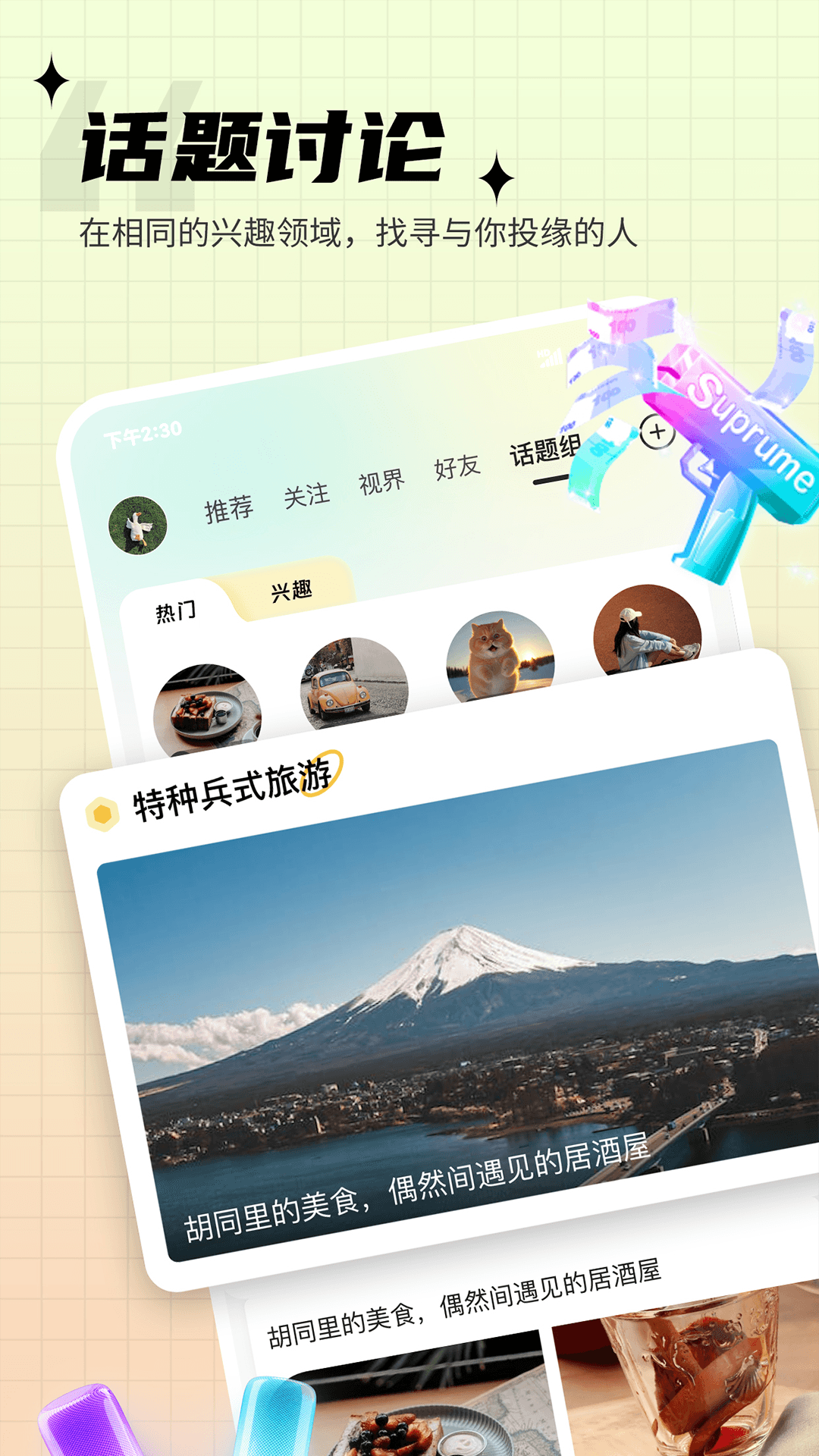 【话题组】您可以选择感兴趣的话题来分享或者查看动态,找到兴趣切入点展开话题,避免冷场尴尬,助力您在陌生人里迅速找到知己。