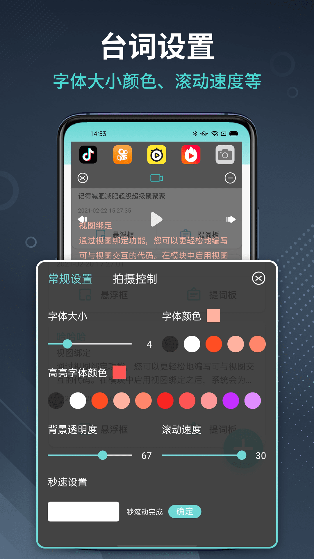 【提词设置】提词板可以自定义设置哦,像背景透明度、字体、播放速度、颜色等多方面都能进行设置,能够帮助您轻松背诵台词,提升视频拍摄的效率,让口播读稿一次性通过。