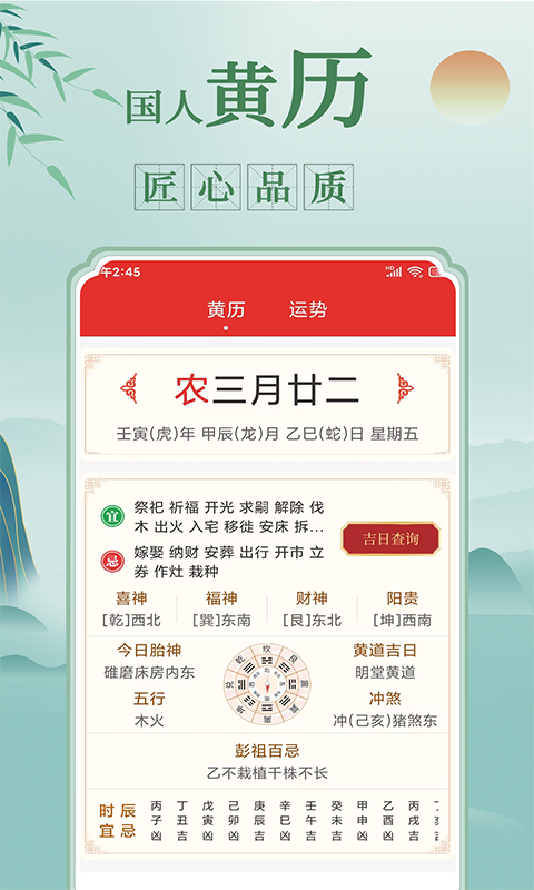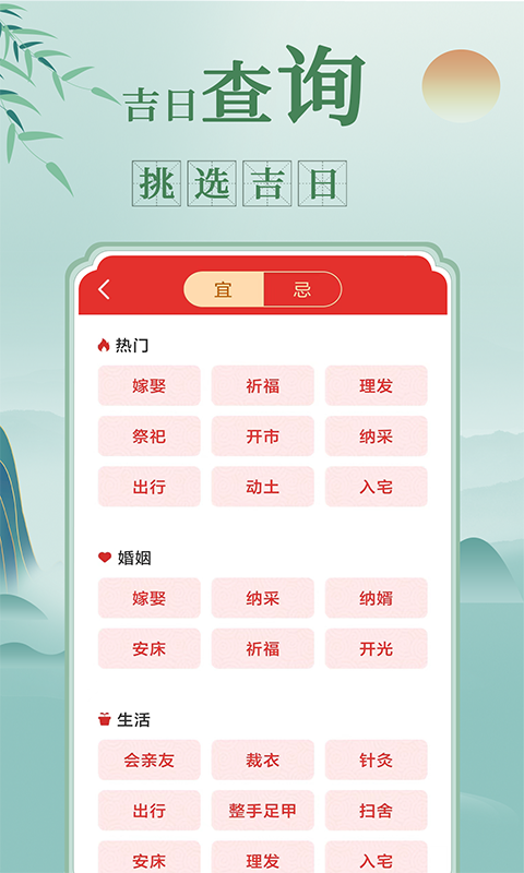 具备传统黄历宜忌的查询功能,无论是结婚、求学、搬家、开业、祈福还是祭祀等常用事项的宜忌日子查询都能满足,这大大方便了我们的日常生活。