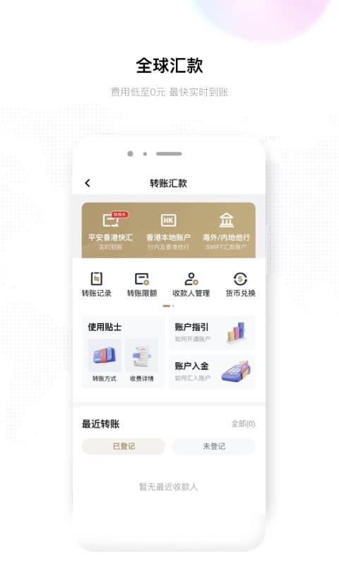 其二,全球汇款服务。如果客户同时拥有平安银行内地和香港的账户,那么两地同行之间进行汇款时能够实时到账,无需漫长等待,并且转账费用最低可至0元。