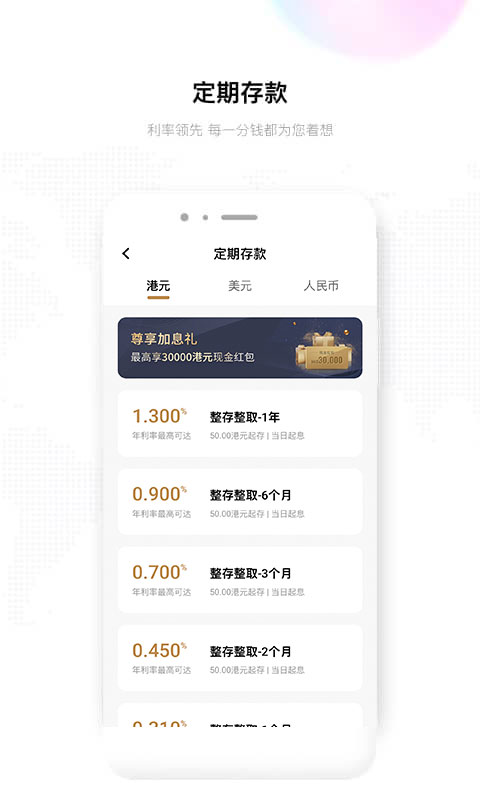其三,定期存款服务。该APP提供港元、美元以及人民币的定期存款业务,其存款利率在市场上具有领先优势。