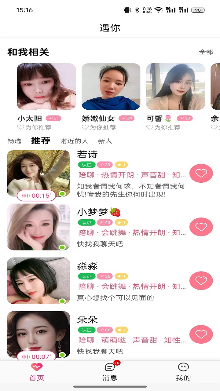 遇你,是一款充满趣味的陪聊软件。在遇你这个平台上,用户能够结识到形形色色的人,进而与更多的伙伴尽情谈天说地,一同畅想人生。于此,你还能够大方展示自己的生活点滴,随心发布日常动态呢。