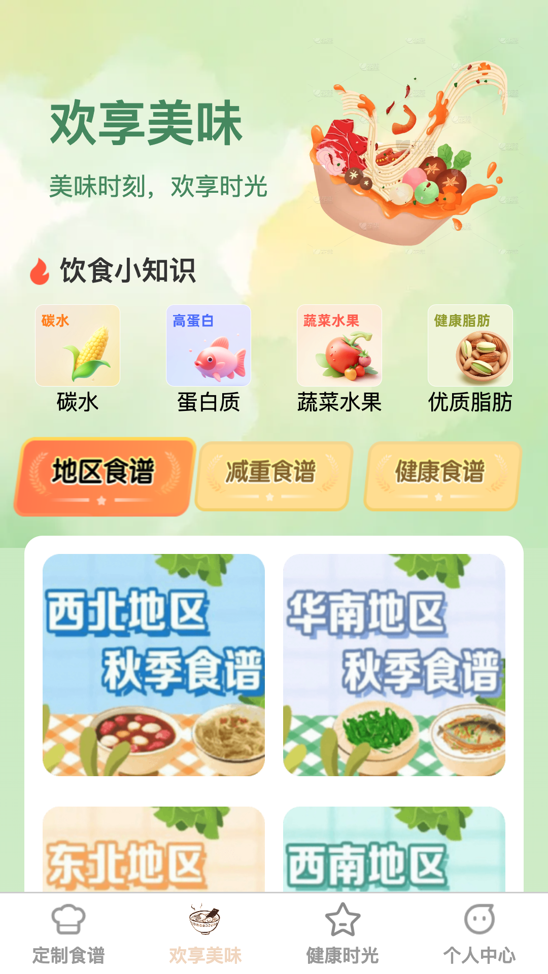 【欢享美味】在欢享美味模块中,您将发现各种饮食小知识,了解碳水、蛋白质、蔬菜水果及优质脂肪的营养价值。此外,我们还提供特色食谱,包括地方特色和减重食谱,以及火锅榜单,让您尽情品味各类美食。
