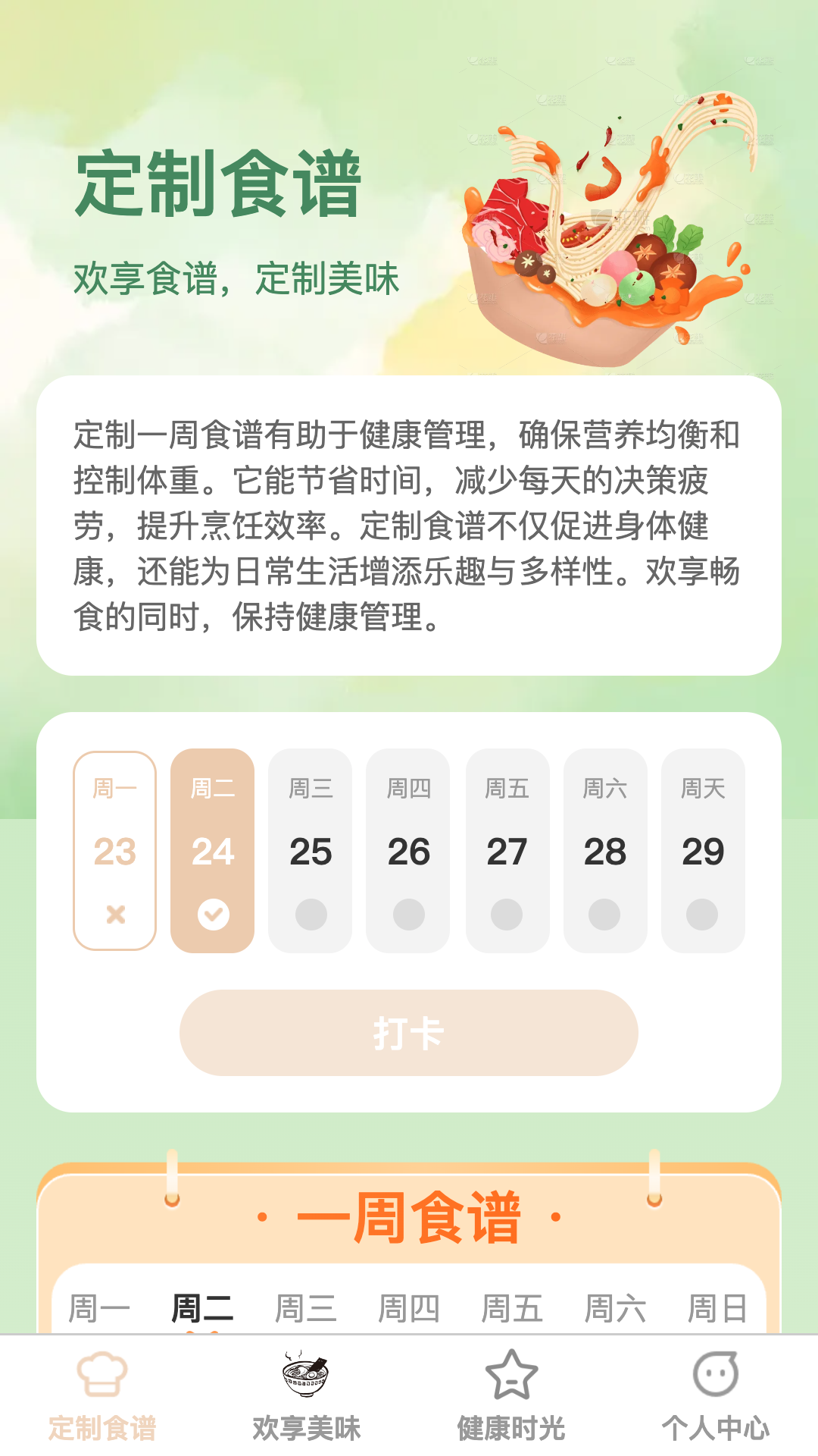 这款独特的应用旨在为您提供丰富的饮食体验与健康管理,涵盖欢享美味、一周食谱和健康时光三大核心功能,助您轻松享受每一天。