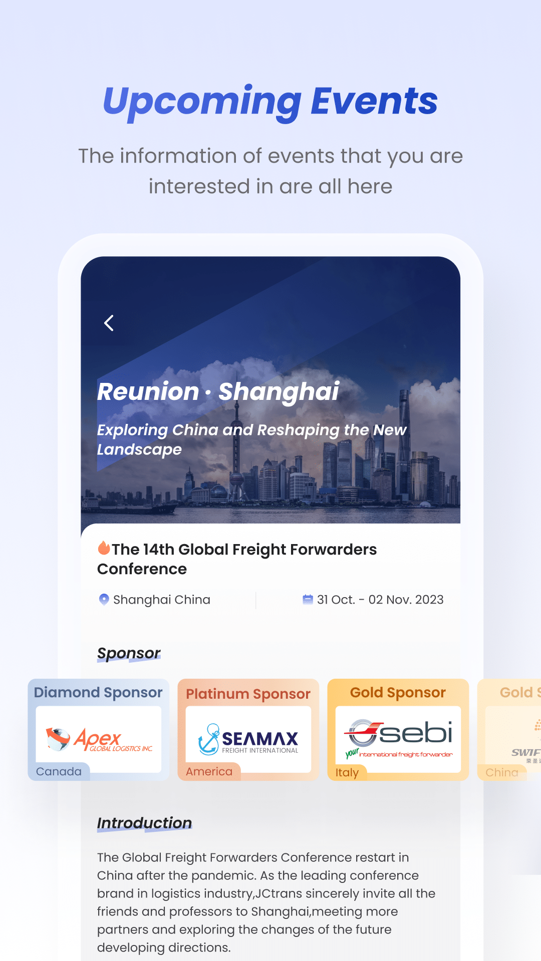 JCtrans专为物流会议打造了一款APP。这款APP涵盖了每场会议的所有必要信息,像会议概况、日程安排、举办地点、交通信息以及参会人员名单等应有尽有。