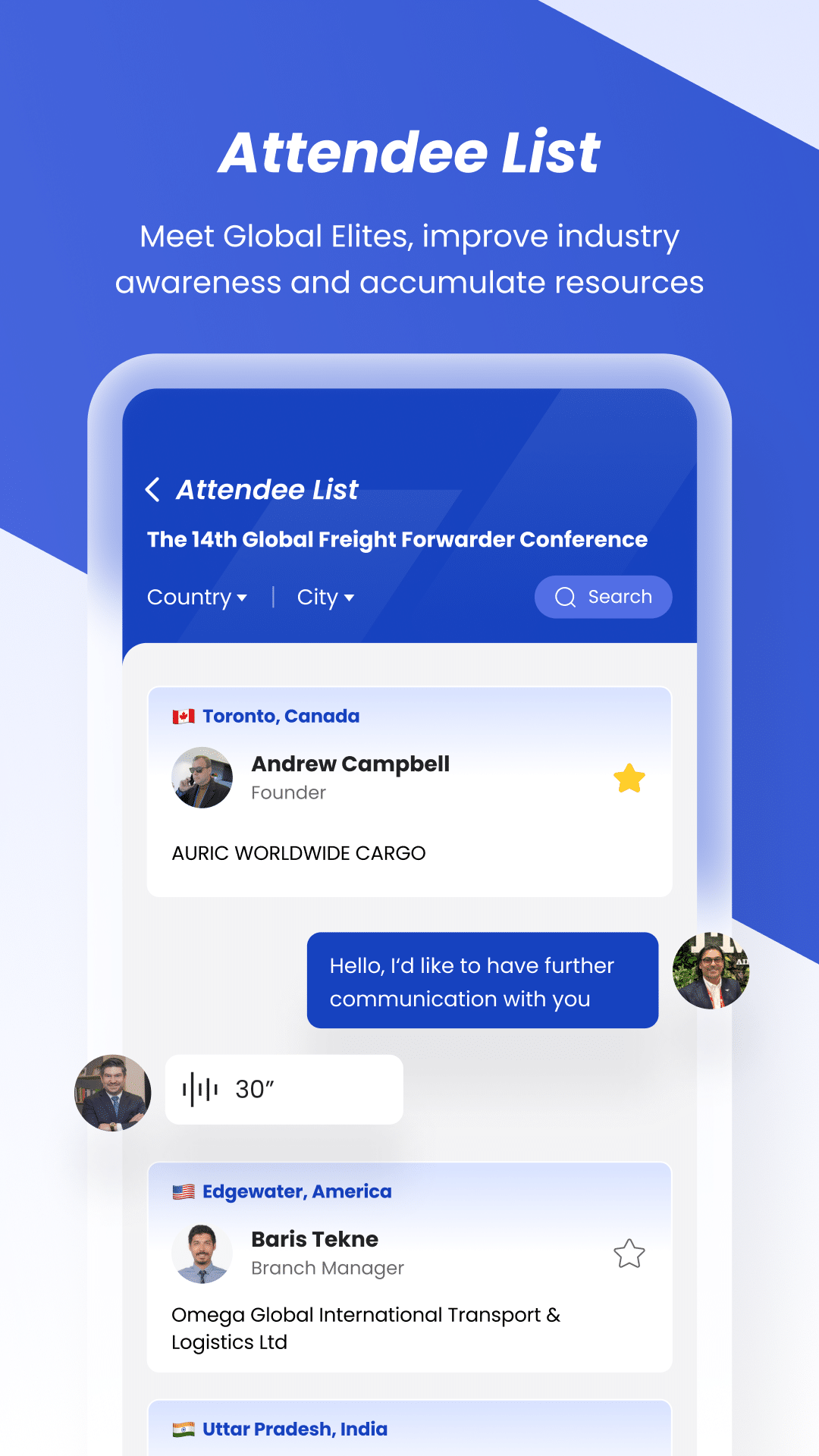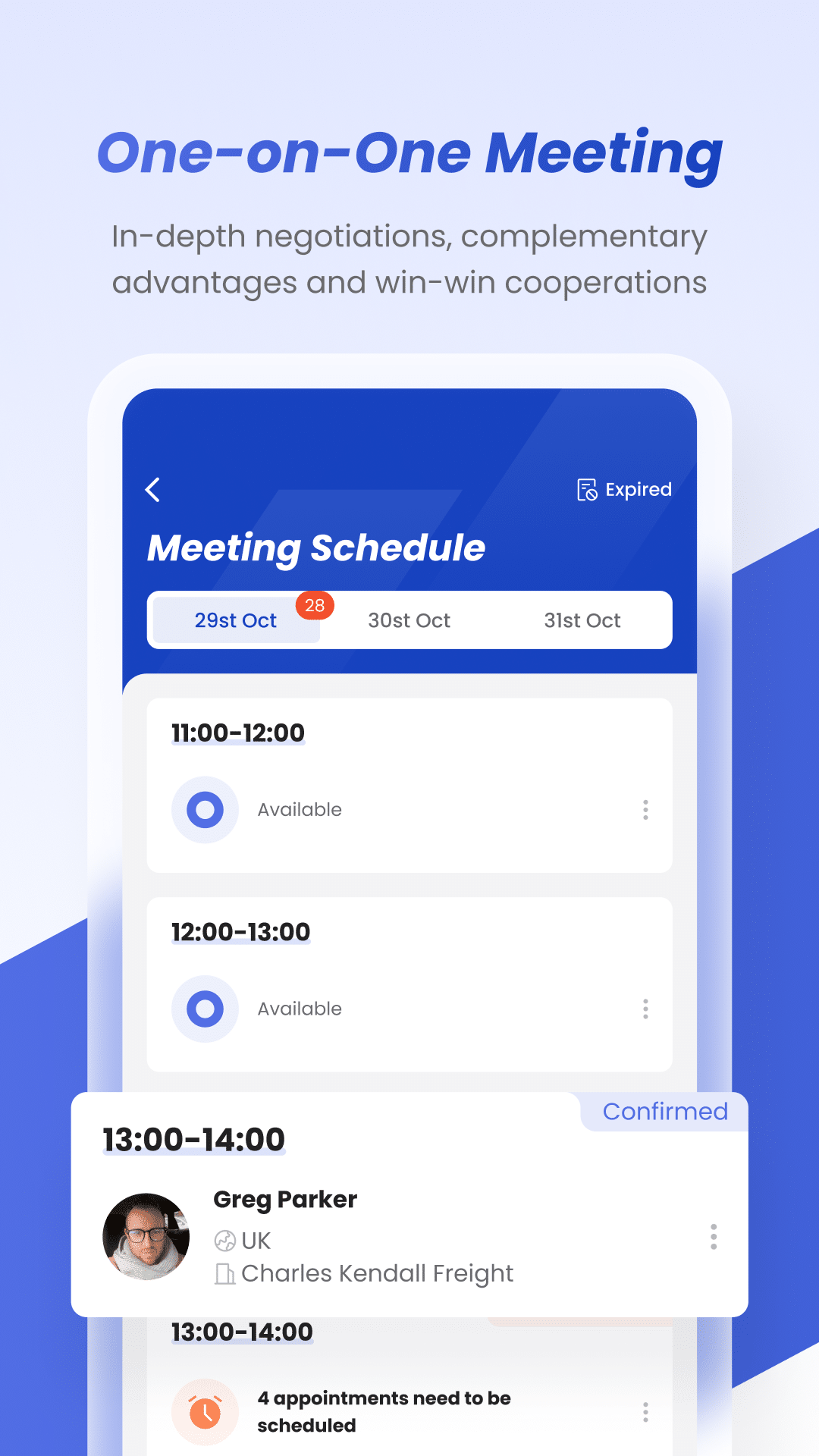 您能够通过搜索国家、城市、公司名称或者参会人姓名的方式,去发掘潜在的合作伙伴,进而轻松搞定一对一洽谈预约。同时,您还可以与其他参会者在线互动,询问他们是否有时间在会议现场进行面对面交流,这种沟通方式既灵活又便捷,能让合作变得更加愉快、轻松。