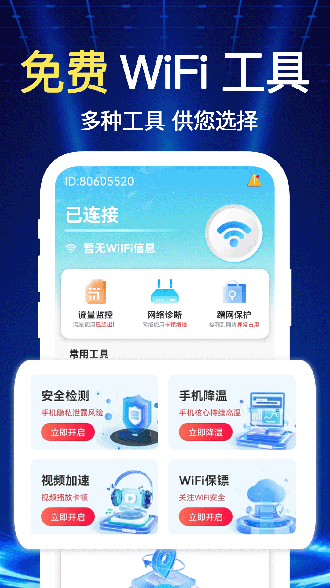 4.贴心小工具:设备安全 手机降温 网络健康检测等,助力您安心使用手机网络。