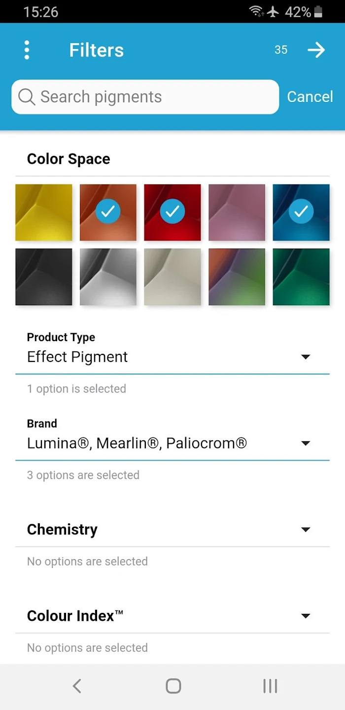 按照不同应用领域的需求,利用多重过滤菜单搜索您所需的颜料,对所选颜料进行分组并保存。您能获得具有视觉互动性的外观印象,像平常观察色板那样将感兴趣的产品并列比较。同时,您可以从中获取技术资料,还能看到颜料在专业色域图中的位置。
