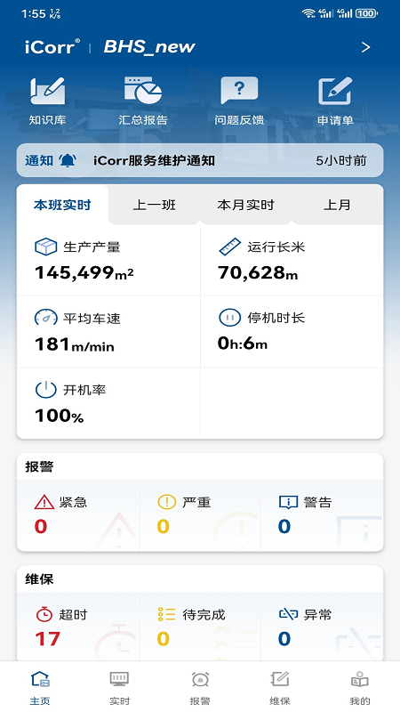 除了报警和维保操作功能之外,iCorr应用程序还拥有一系列有助于管理公司瓦线设备的功能,能让您更全面地了解设备状况。而且,iCorr应用程序还提供了一个直观且易于操作的界面,方便您轻松访问和管理设备。