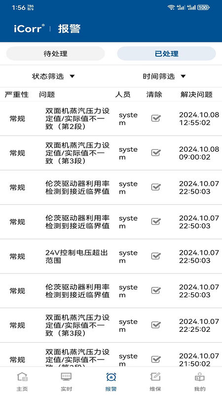 iCorr应用程序还具备报警和维保操作功能,从而使设备管理更为轻松。一旦出现任何问题或者故障,该应用程序就会自动报警,以便您能够及时做出应对措施。同时,iCorr应用程序能够记录维保操作,像维修以及设备部件的更换等情况,这有助于您追踪设备的状态以及维护的历史记录。