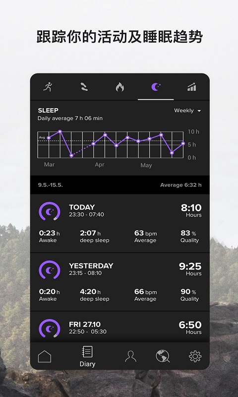 Suunto APP助力您掌握生活与运动。您可以在锻炼概况中追踪关键的活动细节,还能跟踪活动、每日步数、卡路里以及睡眠的趋势。