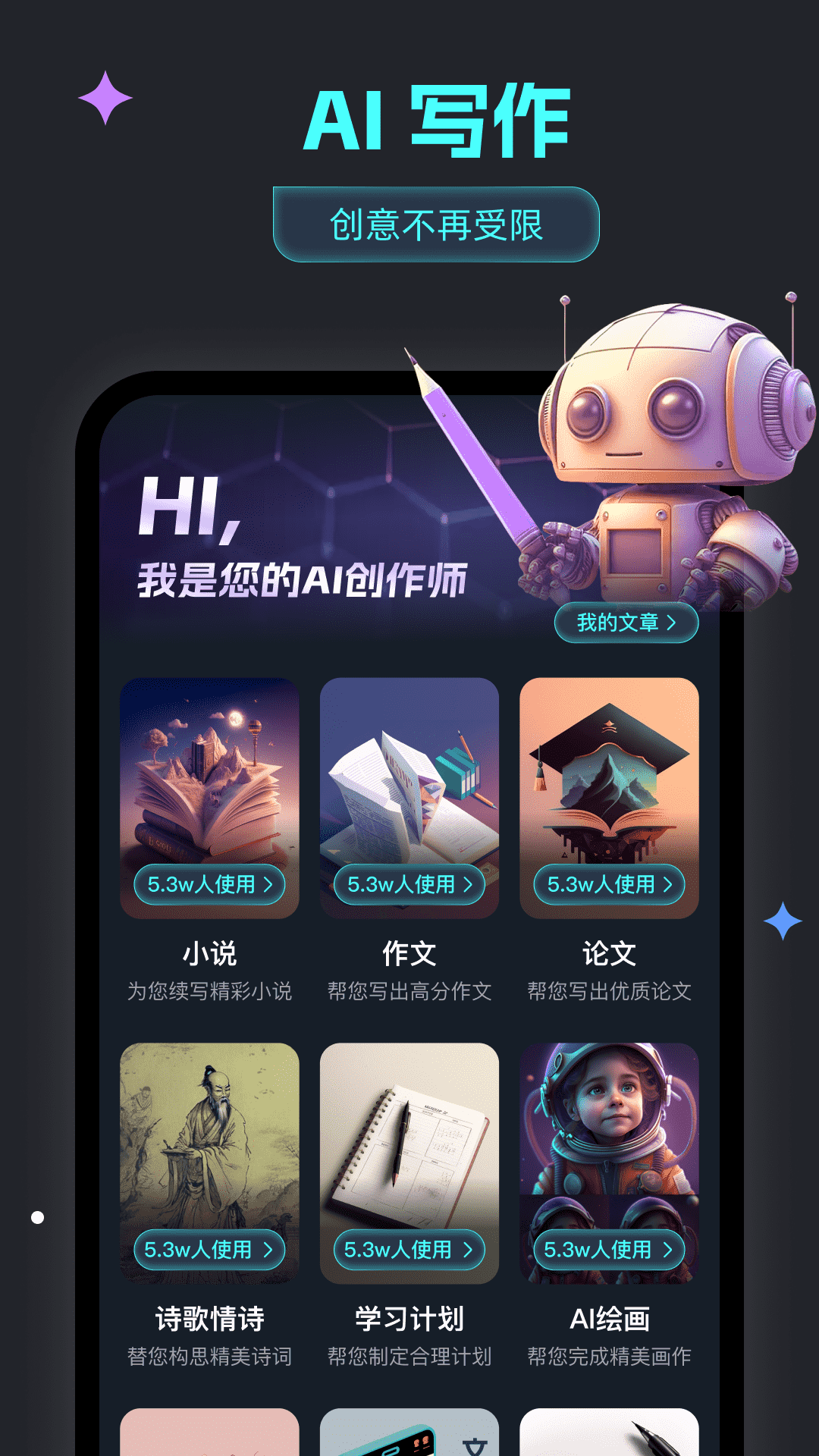 小说、论文、诗歌、学习计划、工作周报、发言稿、朋友圈文案等多种文章类型,它都能根据用户的要求生成。