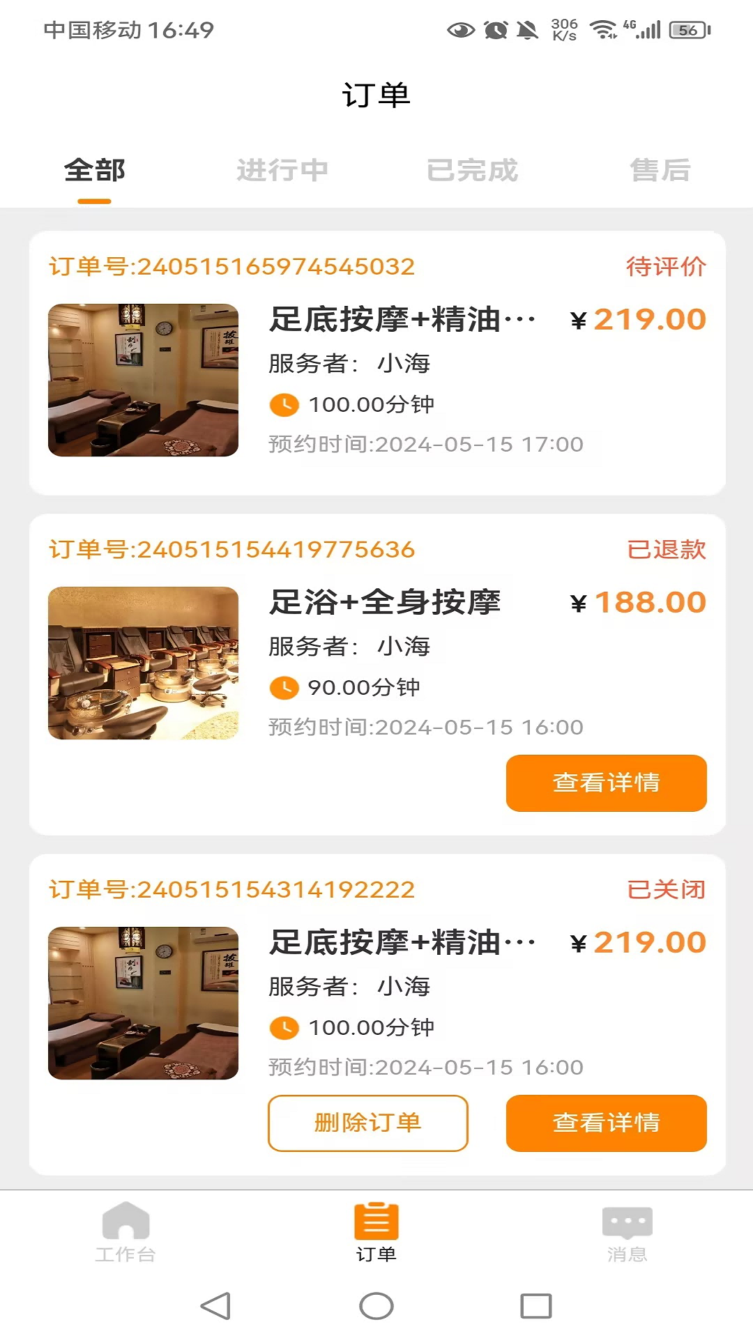- app会对技师的工作记录予以保存,这里面包含已经完成的订单以及用户给出的评价等信息,这方便技师随时查看与管理自身的工作情况。