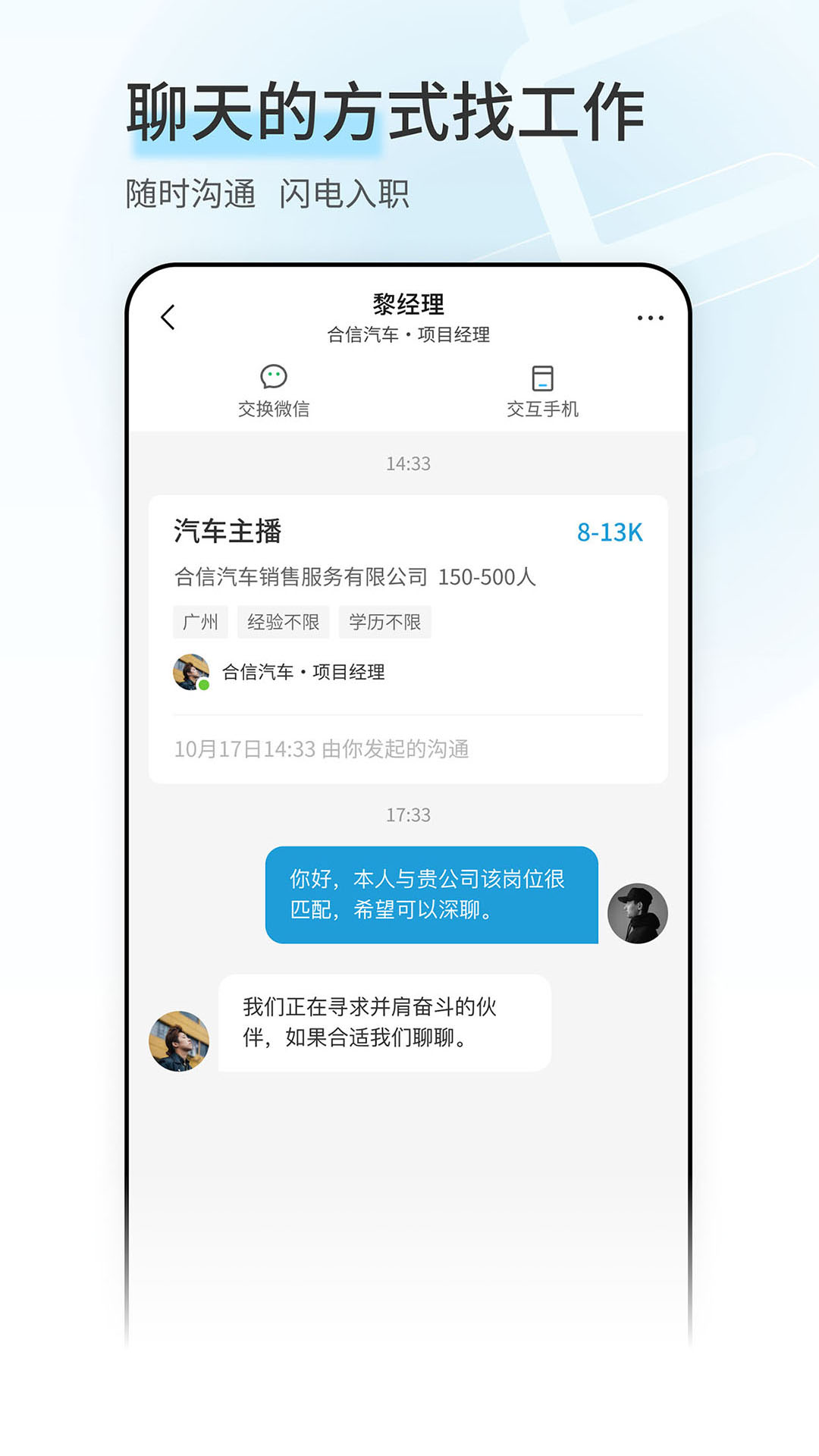 在这里找工作就像聊天一样轻松自在,就跟使用微信App似的,不管何时何地,只要你想,都能随时和对方约聊。聊得合适了,当场就能拍板,然后迅速入职呢。
