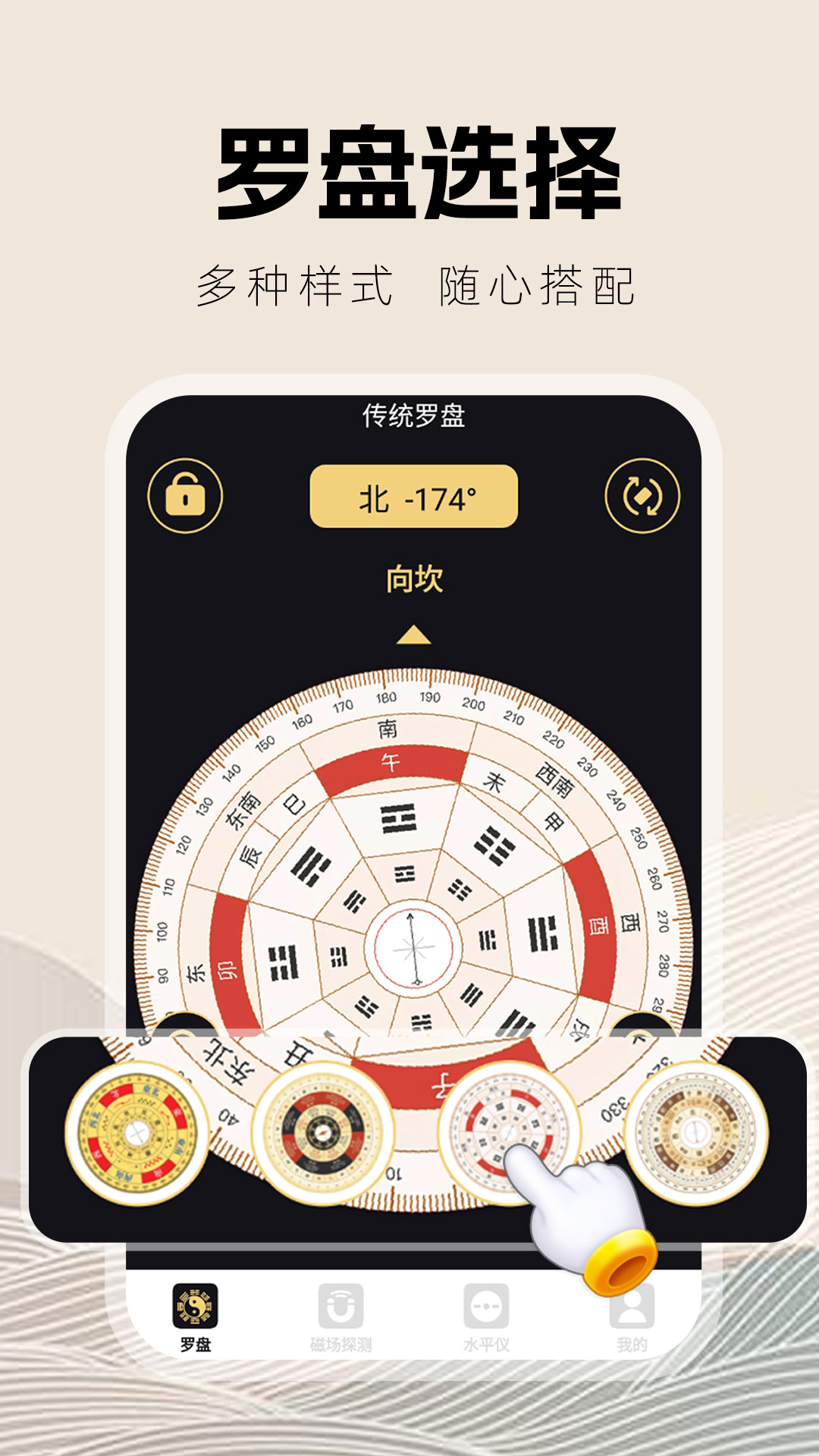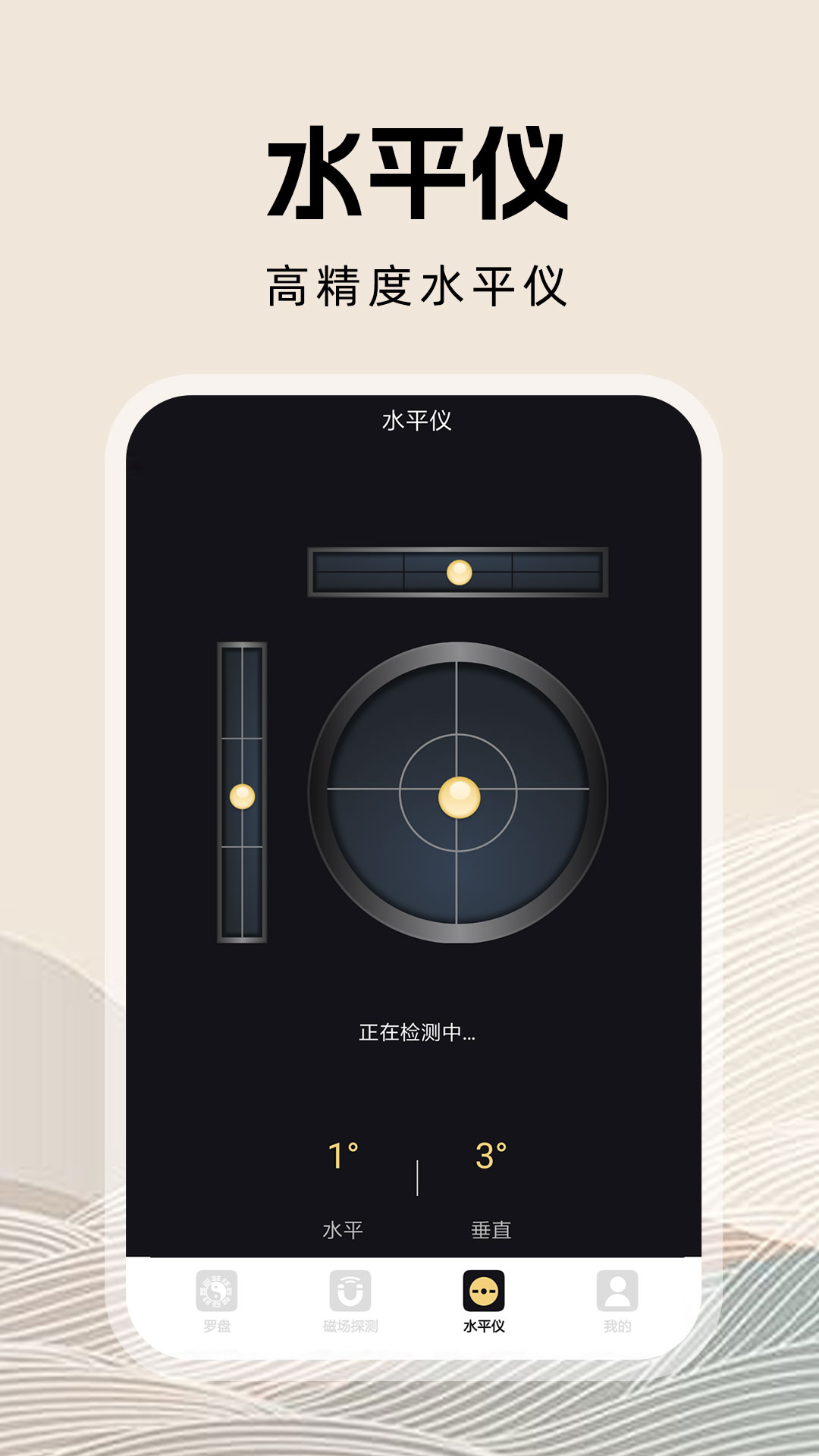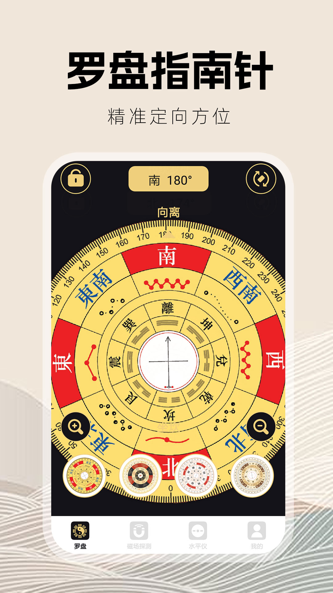这款应用是一款多功能的手机指南针罗盘工具,它可以帮助你辨别方向,确认房间座位朝向,还可以为你提供当前位置的经纬度、海拔、气压等。它还具备直尺、量角器、水平仪、磁场探测等功能。快来下载体验吧~