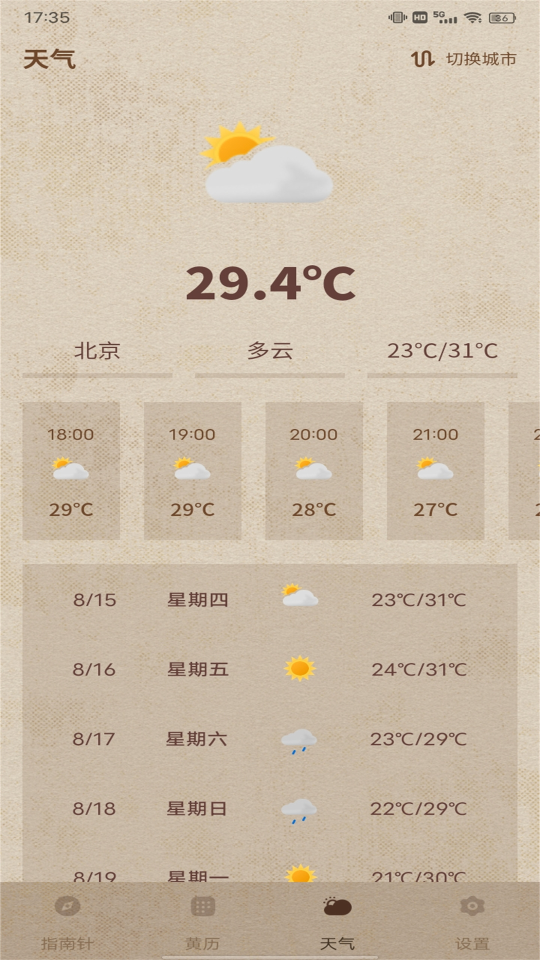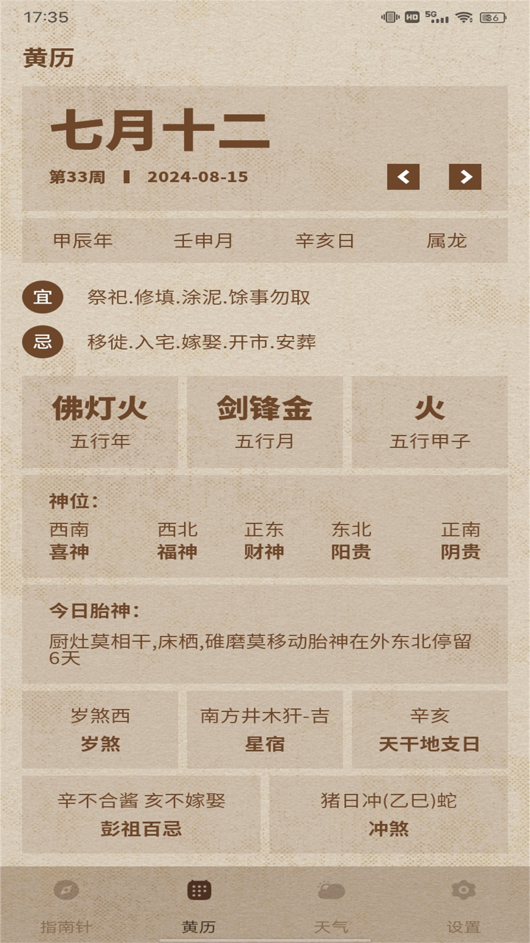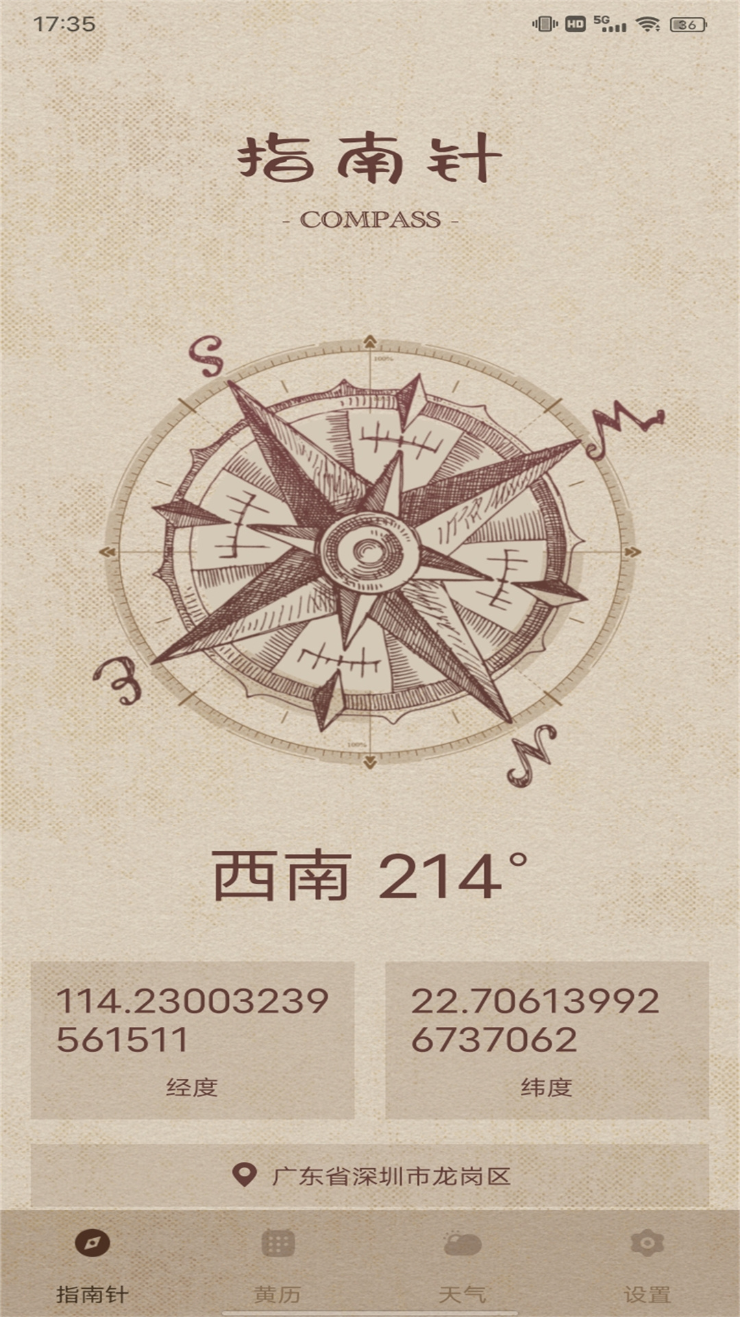 罗盘指南针2024的界面简洁又美观,操作起来非常简单,很容易上手哦。它能够快速显示经纬度,是一款超级酷的指南针实用小工具。对于那些容易迷路的路痴来说,简直就是救星,可以帮助他们轻松分清东南西北,从而顺利找到正确的方向。而且呀,这里还有老黄历,能进行宜忌日查询,还有天气情况等小功能呢。它就像是您生活中的贴心小助手,这么棒的工具,快来体验一下吧。