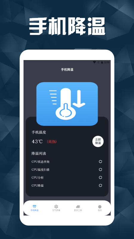 你是否有手机运行时发烫的困扰呢?不用发愁,只要下载Tapteqmax,就能实现极速降温,并且可以随时监控CPU状态,让你在使用手机的时候既安心又能畅快地玩。此外,这款软件还包含其他实用的生活小工具,例如能查看空气质量,也能了解天气预报等。赶快下载Tapteqmax来体验一番吧。