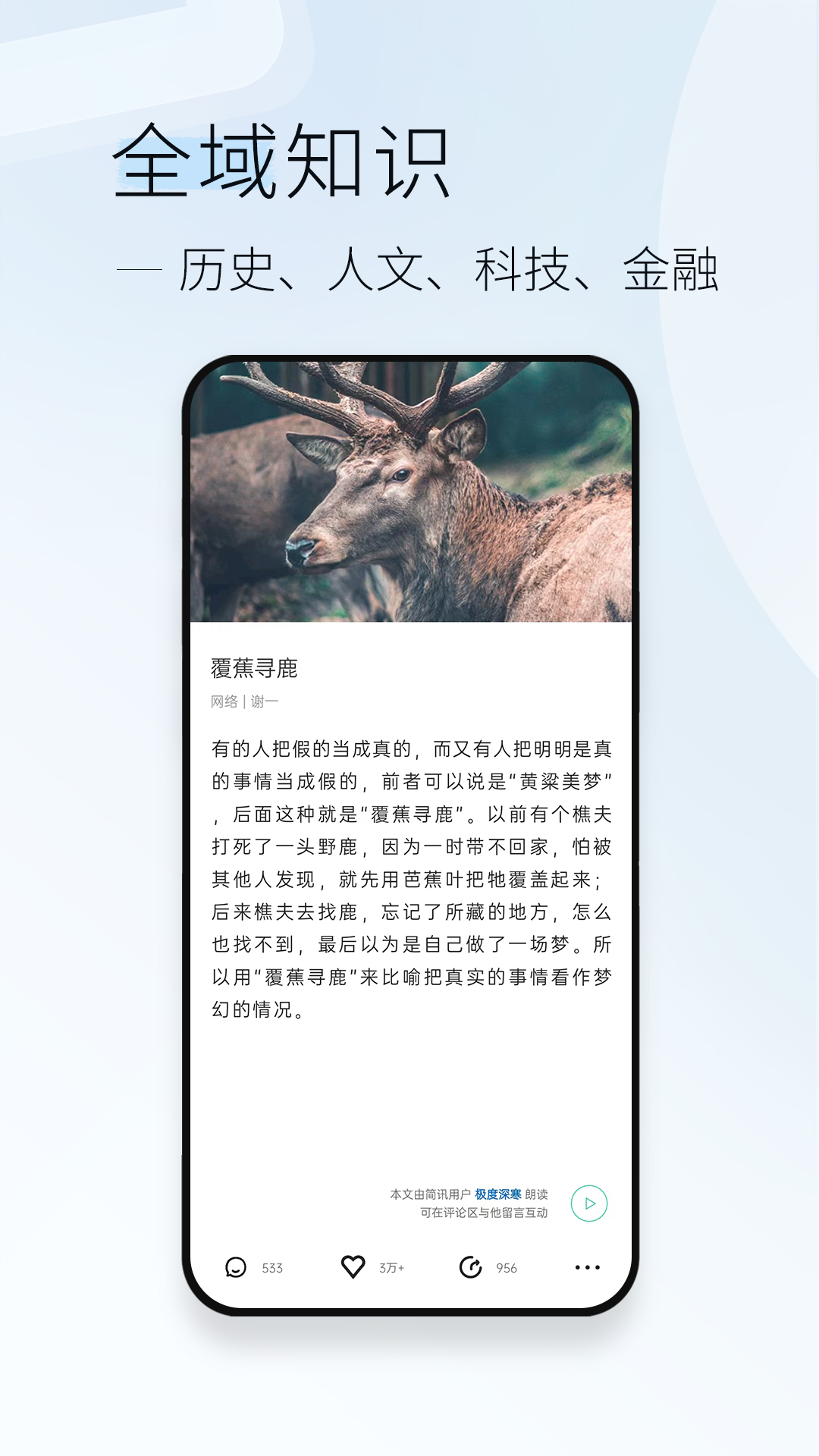 比如说在啤酒馆里,除了百威、嘉士伯和1664这些常见的酒,是否就不知道该点什么酒了呢?简讯不是那种能马上告诉你该点什么酒的App,它的价值在于提供一种平时没有思维边界的阅读方式。简讯中的每一篇内容都很简短,随机阅读,读到哪篇是哪篇,快速读完一篇后马上就能翻到下一篇。这样,在有限的时间里能够阅读到更多的精华、结论、金句等内容,通过量变自然引发质变,逐步拓宽眼界。