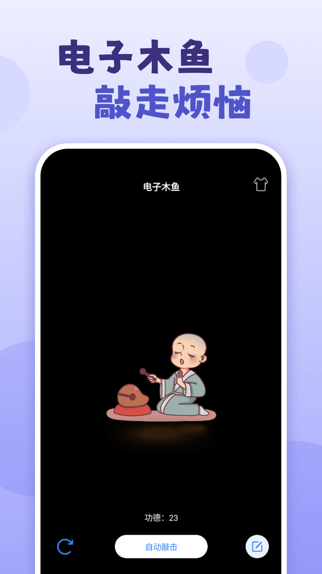 (1)【敲击木鱼】玩家模拟电子木鱼的敲击效果,获得功德,可以自动或者连续敲击,听着木鱼声音放空自己,获得心灵的安静。