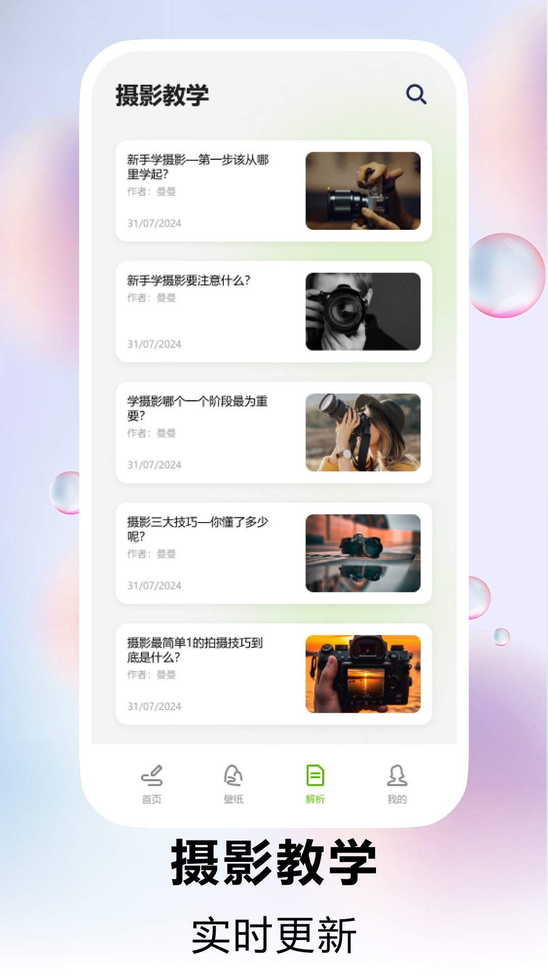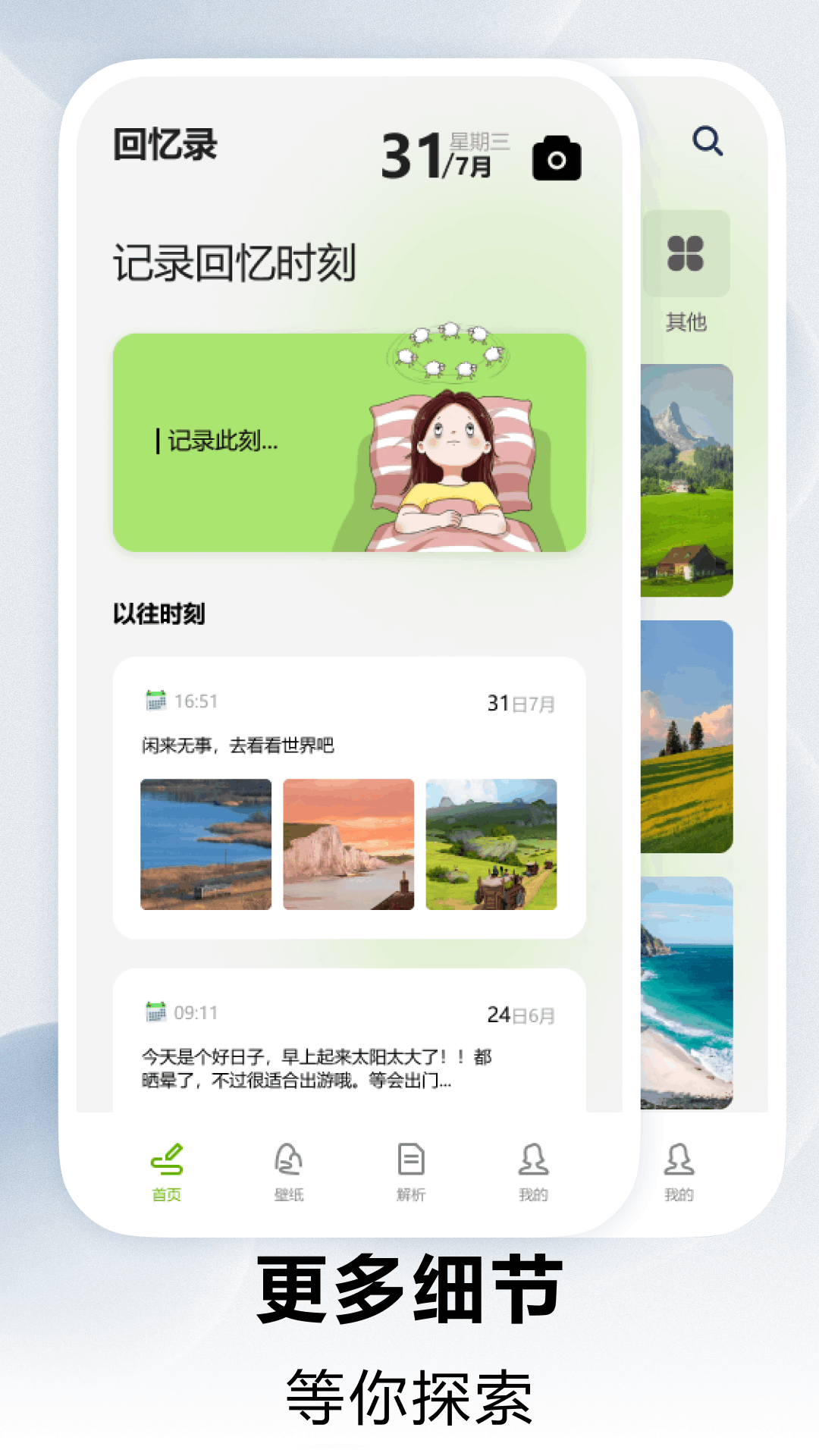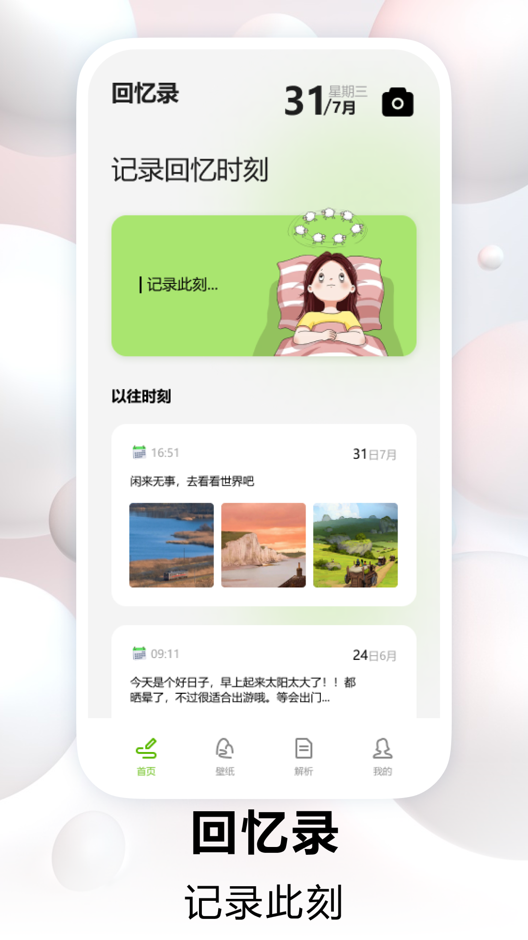 这是一款chic cam,它内置有各类高清壁纸。同时,它还提供摄影教学内容,即使你足不出户,也能够拍出充满创意的人像作品。另外,它具备回忆录功能,让你在任何时候、任何地点都可以记录下那些充满回忆的时刻。