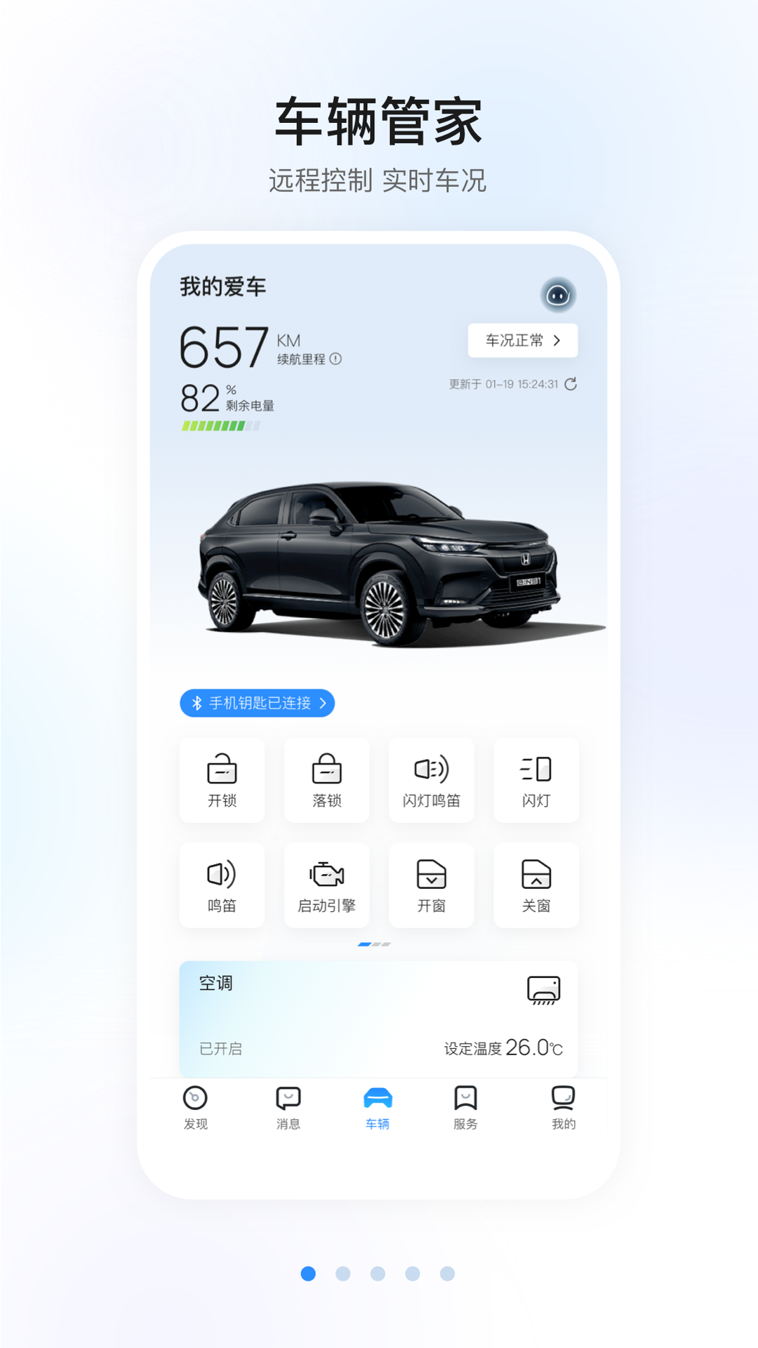 【远程操控】无论何时何地,您都能通过APP查看车辆状况、实时定位车辆所在位置,并且可以对空调等进行控制。