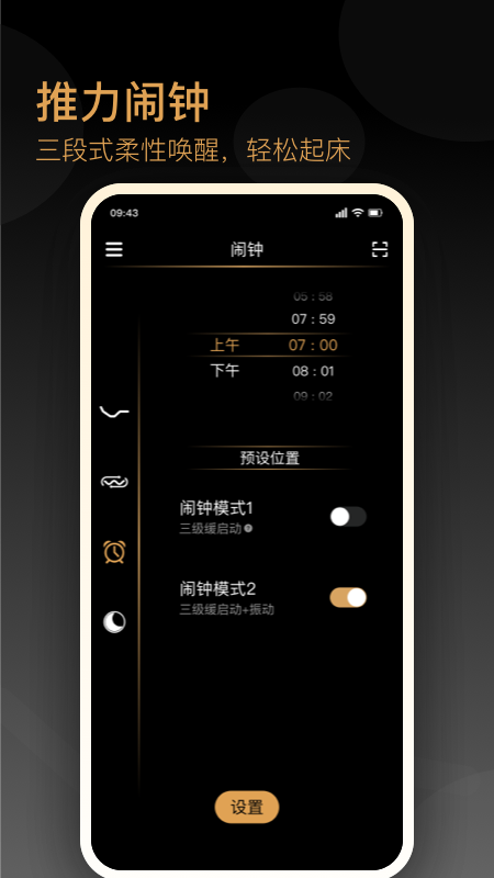 再者是推力闹钟功能,其独特的三段式柔性唤醒方式,让您起床不再困难,能够轻松开启美好的一天。
