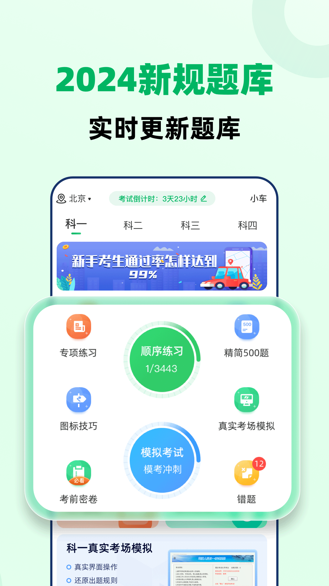 1. 全新交规题库同步更新,多种车型的专用试题练习都能支持;
