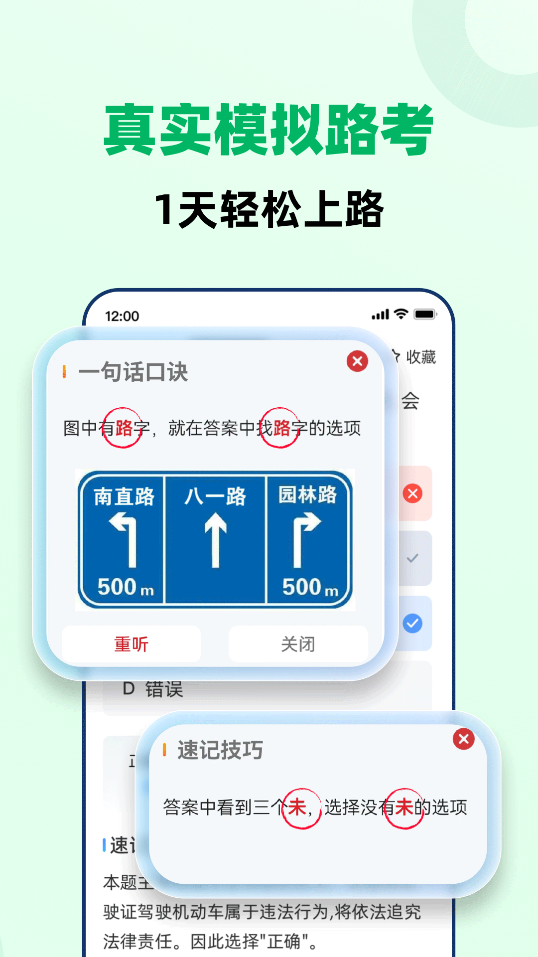 对于驾考中那些难题、怪题、偏题、易错题等令人头疼的问题,我们的讲师会针对每一道题进行知识点解析。这样您在记忆交通标志、交警手势的时候就不会再混淆不清了。在休息的时候,您还能轻松巩固知识,而且模拟考试能尽量还原试题难度,模拟真实的考试场景,让您顺利考取驾照。