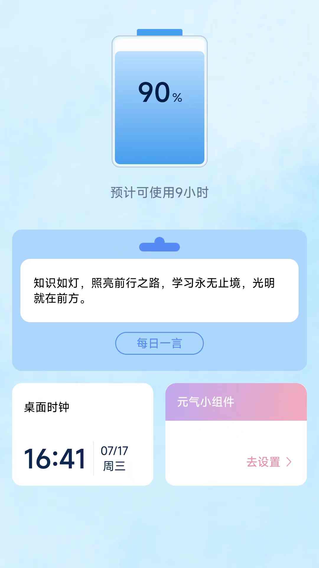 5. 小组件设置: 通过小组件功能,您可以根据个人喜好和需求,自定义显示在桌面上的信息模块,包括电量、时间等。