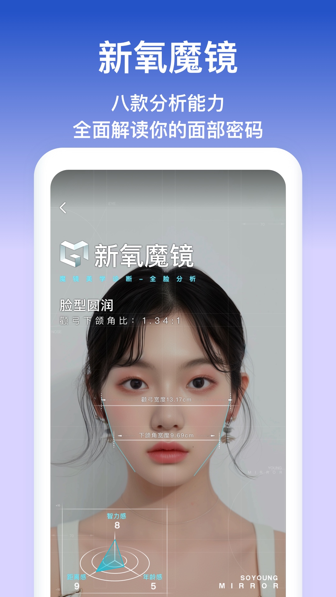 【智能测脸】:新氧魔镜自主研发的AI美学诊断功能,只需一键测脸,就能精准判断你属于哪种美。