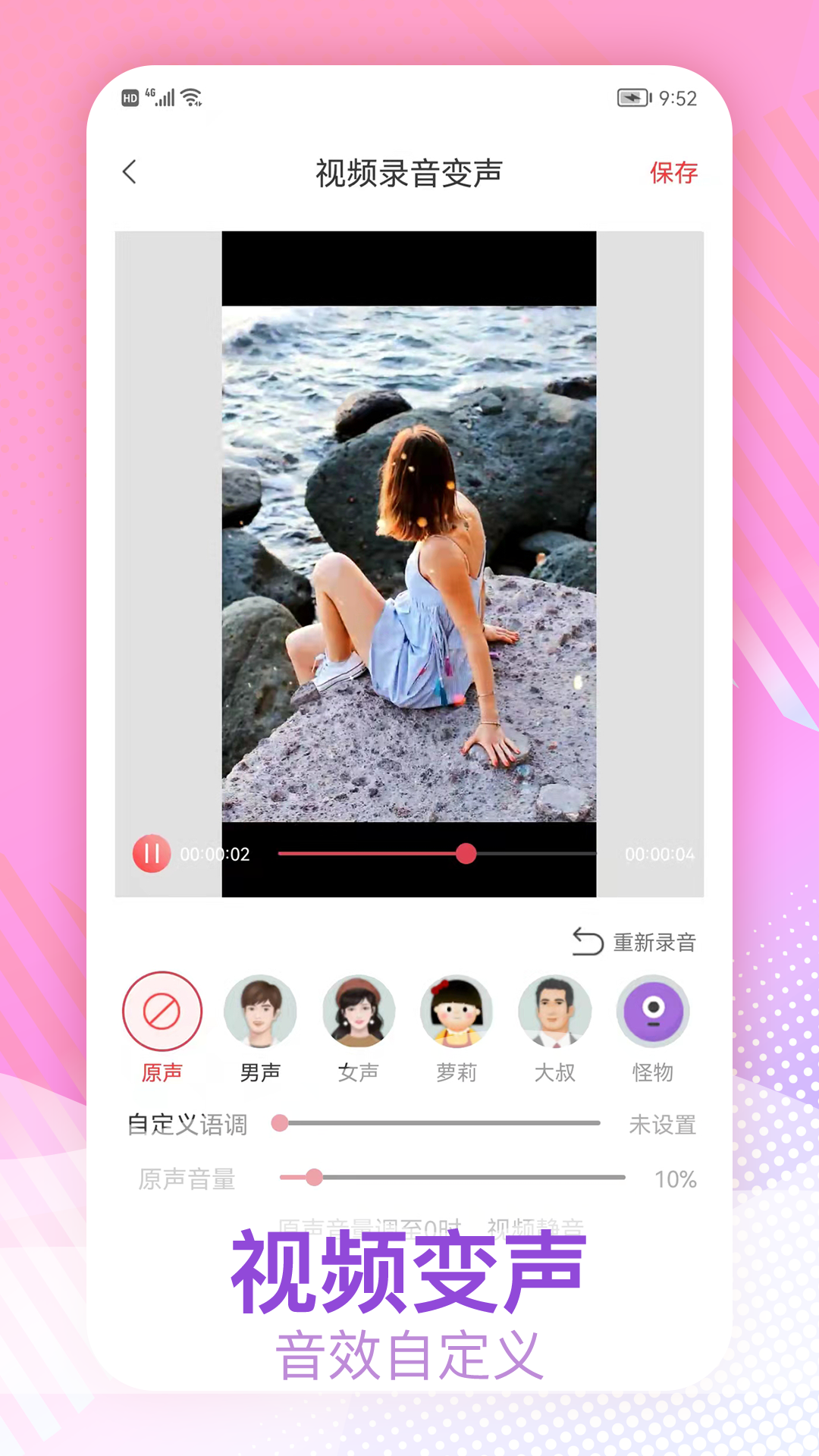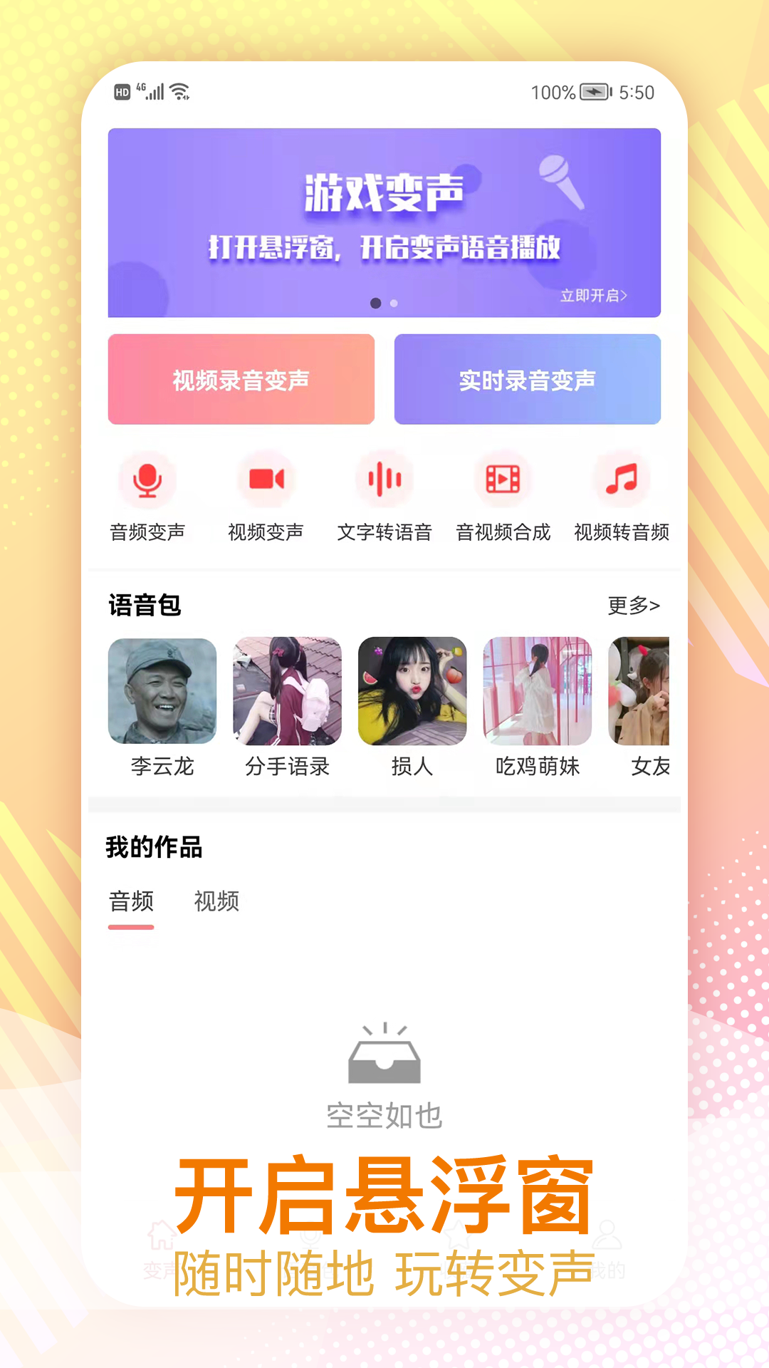 视频变声器支持视频变声、视频实时录音变声、音频变声、实时录音变声、文字转语音、音视频合成、视频转音频、语音包变声等。包含女变男、男变女、萝莉、大叔、怪物音还可自定义音效!
