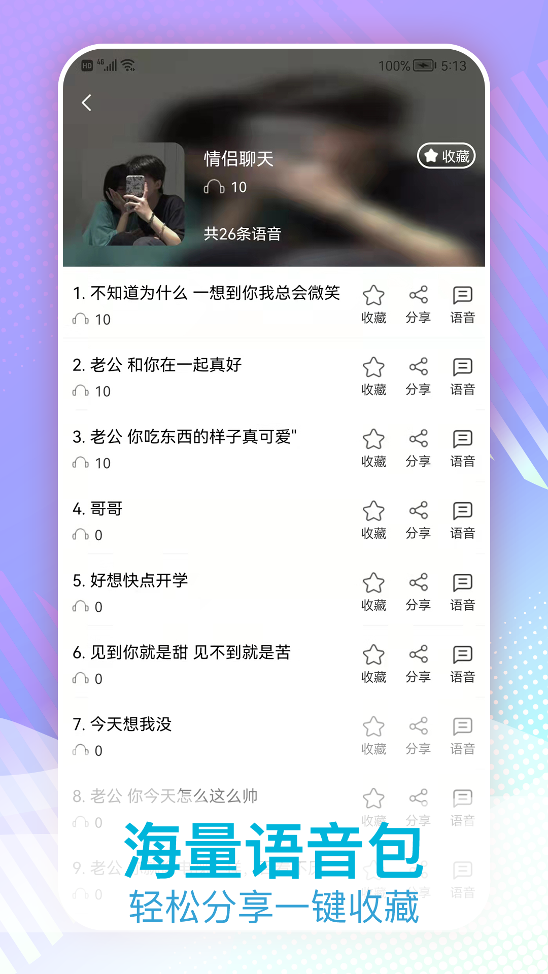 7. 海量语音包:甜美语音包,其中有私聊语音、游戏语音、撒娇语音、吃鸡语音、萝莉语音、大叔语音、暖男音等。