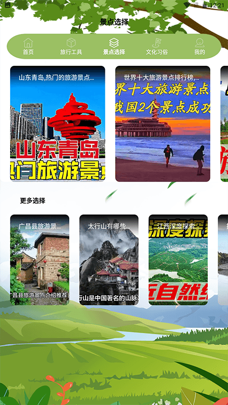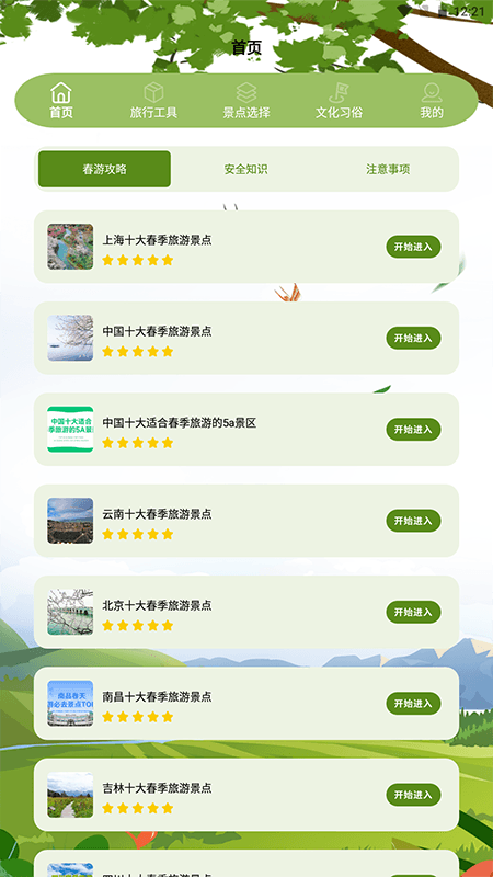 春之谷:春天,在中国民间有着一种美好的传统活动——春游。春游是人们结伴到郊外原野去远足踏青的活动,期间还会开展各种各样的游戏等项目,这可是一项重要的旅游习俗呢。你看,春天是多么迷人的季节啊,细雨轻柔地滋润着世间万物,桃李竞相绽放吐露芬芳;春风轻柔地吹拂着杨柳,杏花如雪般飘落如雨。在一年之中,最适宜踏青赏花的季节无疑就是春天了。本App将为大家分享几处特别适合春天前往游玩的旅游地哦。
