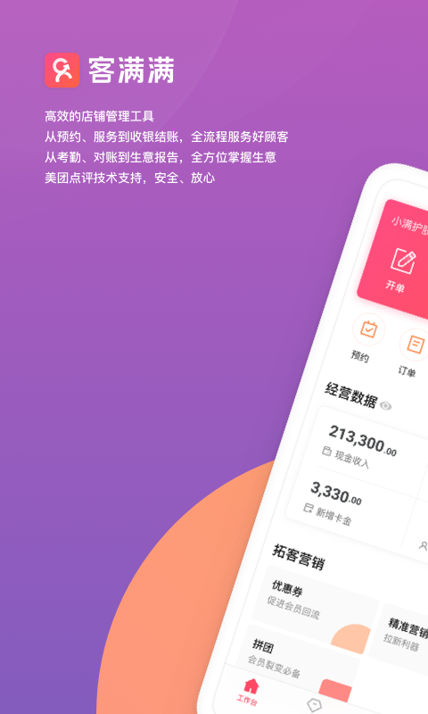 客满满,是美团专为美业商户打造的一款店铺管理系统,我们致力于帮老板服务好顾客、打理好店铺,助力商户提高收入、降低成本。