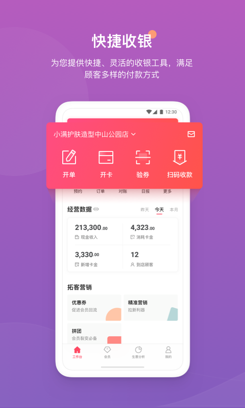 【会员营销】提供多样的营销工具,发券、拼团、短信营销、微信公众号,帮老板拉更多的新客、让会员更愿意到店服务。