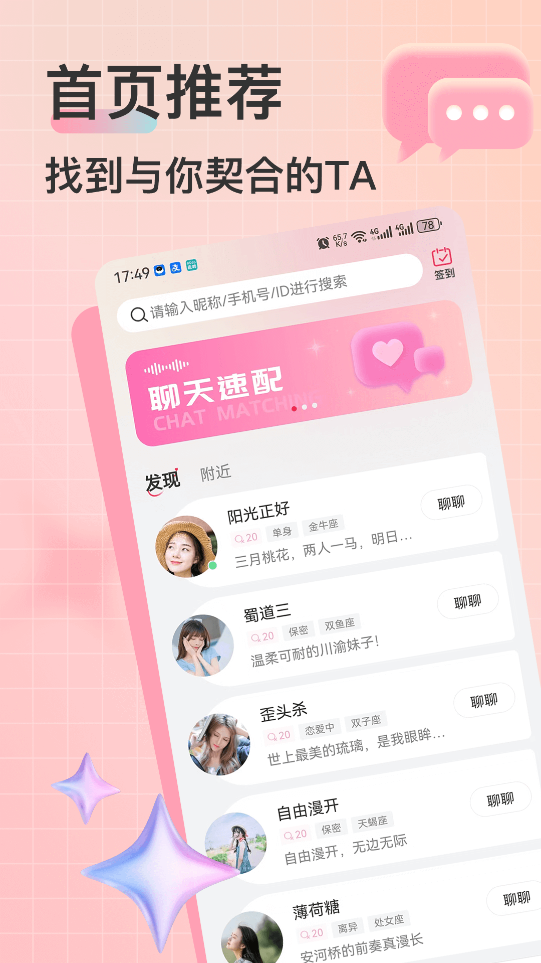 【附近交友】同城交友软件,根据地理位置,为你推荐附近合适的同城单身异性:附近有缘人一键闪聊,线下约见,来遇见你有趣的灵魂伴侣。