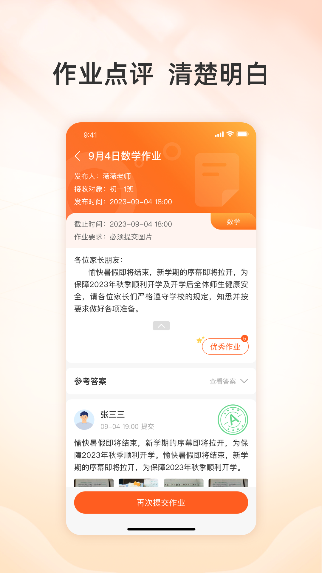 【作业管理】老师可以发布作业、设定提交期限,家长可以查看作业详情、督促孩子提交作业,作业提醒功能确保家长不会错过任何作业要求。