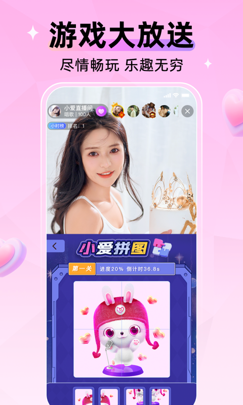无论何时何地,你都能在这儿聊天交友,还能K歌卖萌呢。这里有动感的音乐相伴,清新可爱的风格令人愉悦,主播们实时互动,陪你聊天、玩游戏。他们颜值高又有内涵,还善于紧跟热点,各种各样潮流的直播内容让你心跳加速。这里还有高颜值又时尚、能歌善舞的小哥哥和超级卡哇伊的小姐姐进行直播哦!