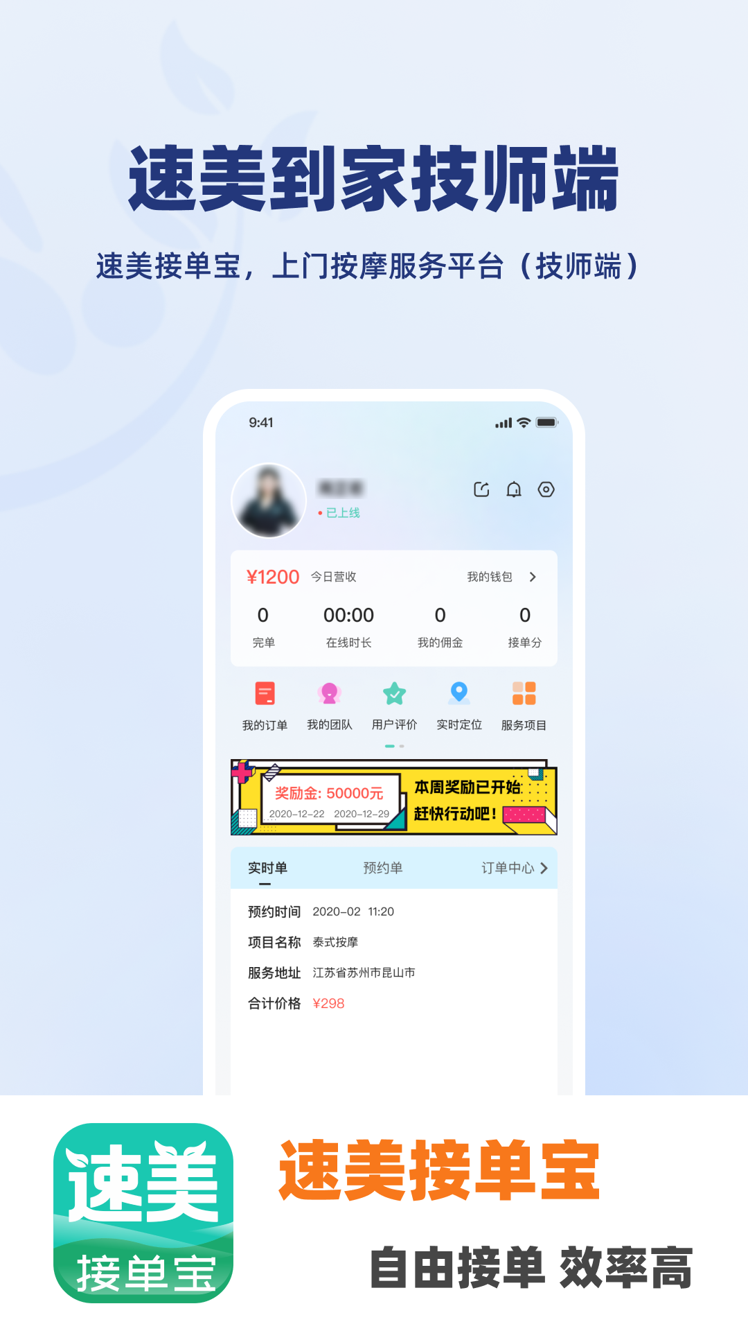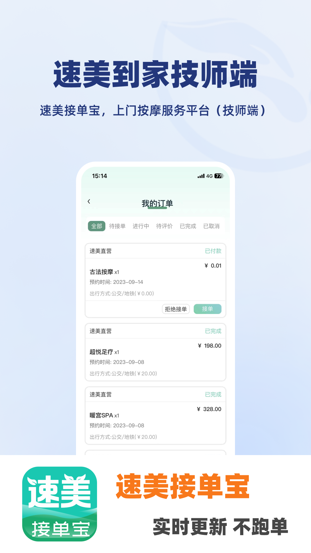 速美接单宝是专为上门服务技师量身打造的一款线上接单产品,帮助技师解决就业问题,技师不用实体门店坐班,在家即可接单,适用于家政保洁、家电维修、推拿按摩、搬家拉货、家电清洗、生活便民等行业线上接单技师。