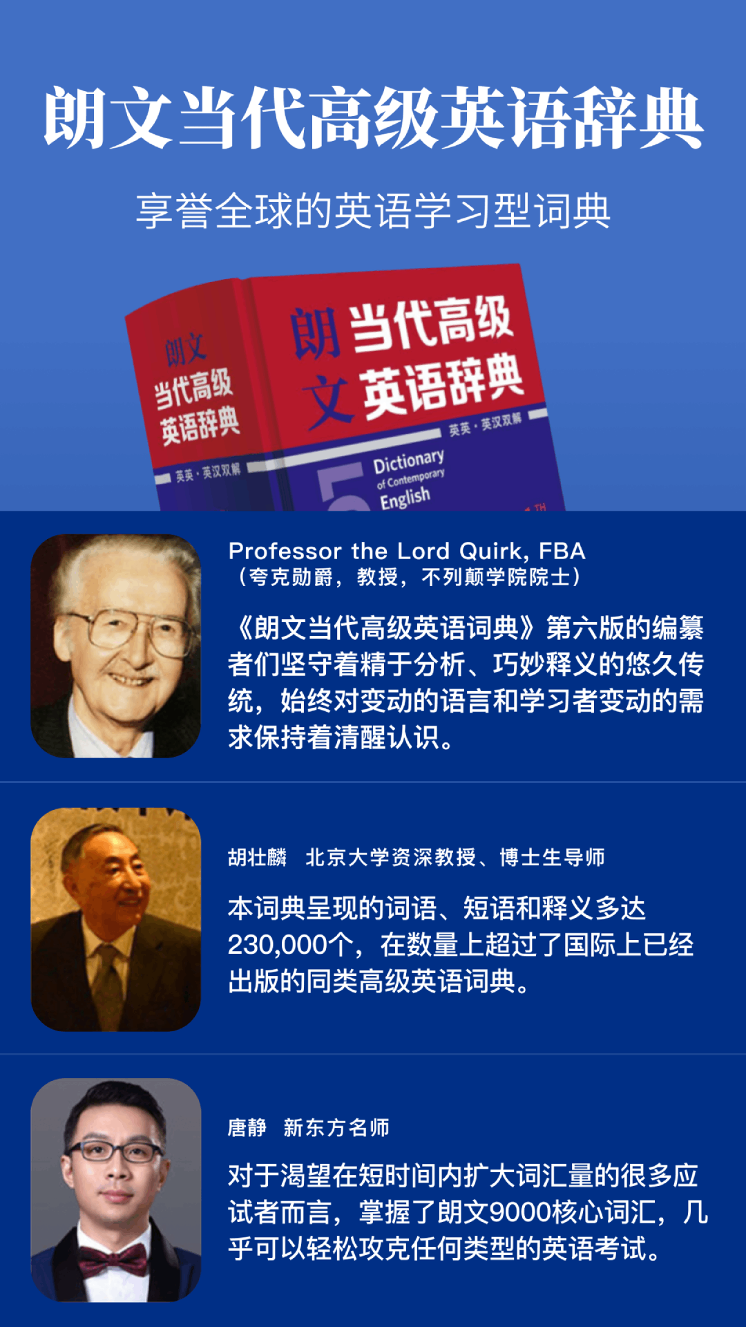 《朗文当代高级英语辞典》于1978年面世,这是一部在全球都享有盛誉的英语学习型词典,受到世界各地英语学习者的广泛喜爱,也得到了行业专家和名人的大力推荐。