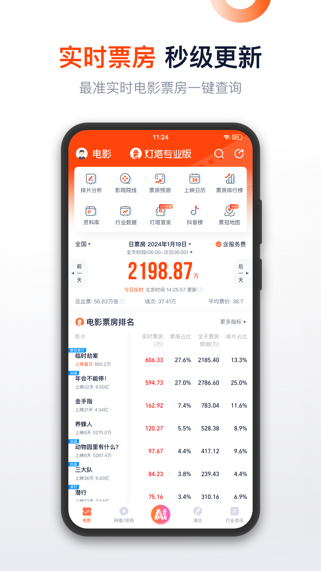 1. 秒级实时票房:可让用户轻松掌握大盘和影片的票房情况,并且支持按照档期和地区来查询电影票房等各项指标。