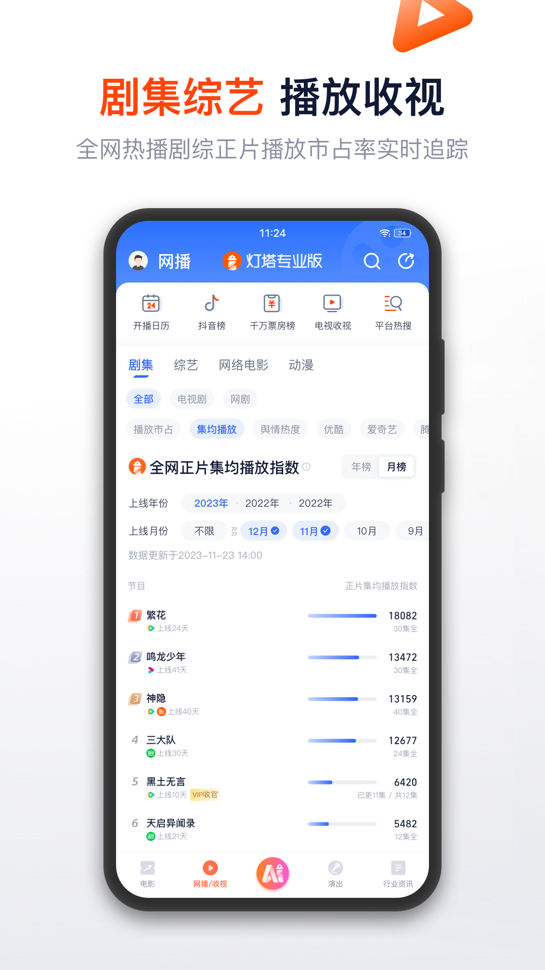 4. 网播播放数据:包括全网剧综正片播放的市占率;同时还提供优酷、爱奇艺、腾讯视频、芒果网络电影的分账数据。