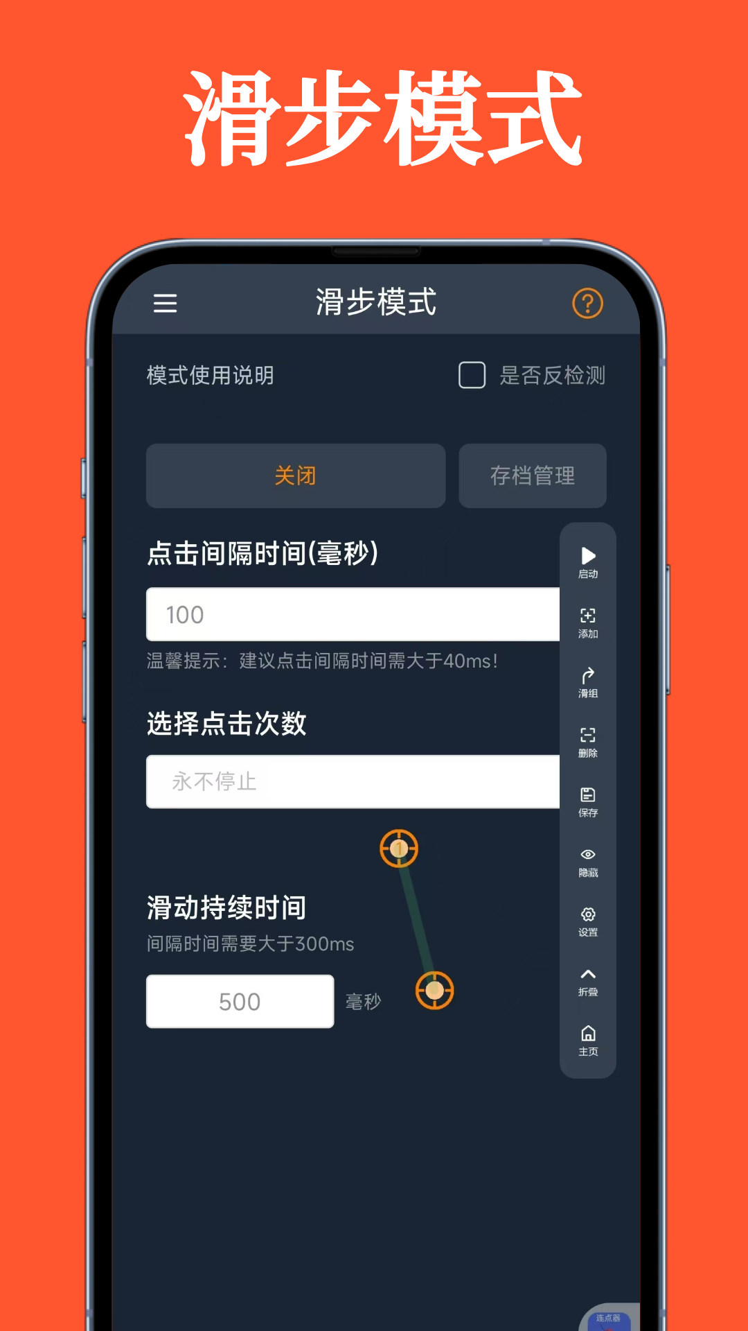 超级快点连点器是一款旨在优化用户日常交互操作的高效自动化工具。它拥有三项关键特性:首先是智能点击功能,能够复制连续快速的点击动作,适合游戏中的迅速响应或是日常任务中的重复性点击;其次是顺滑的滑动功能,它可以复现用户手指在触控屏上的滑动路径,适用于需要连续滑动的场合;最后是先进的多触点控制功能,它支持同时或依次激活多个触控点,为执行复杂动作提供便利。这款超级快点连点器以其直观的用户界面、可定制的设置选项和可靠的性能,助力用户节约时间并提高工作效率,无论是在游戏竞速、自动化测试还是日常使用中都能显著提升效率。