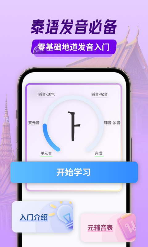 泰语元辅音学习:要掌握泰语就得从基础的元辅音开始。我们特意添加了元辅音学习模块,这个模块借助生动的图示、发音示范以及练习题,助力您精准地掌握泰语发音的基础内容。