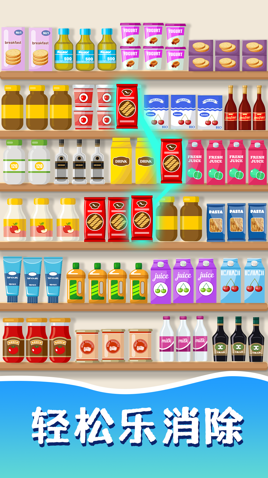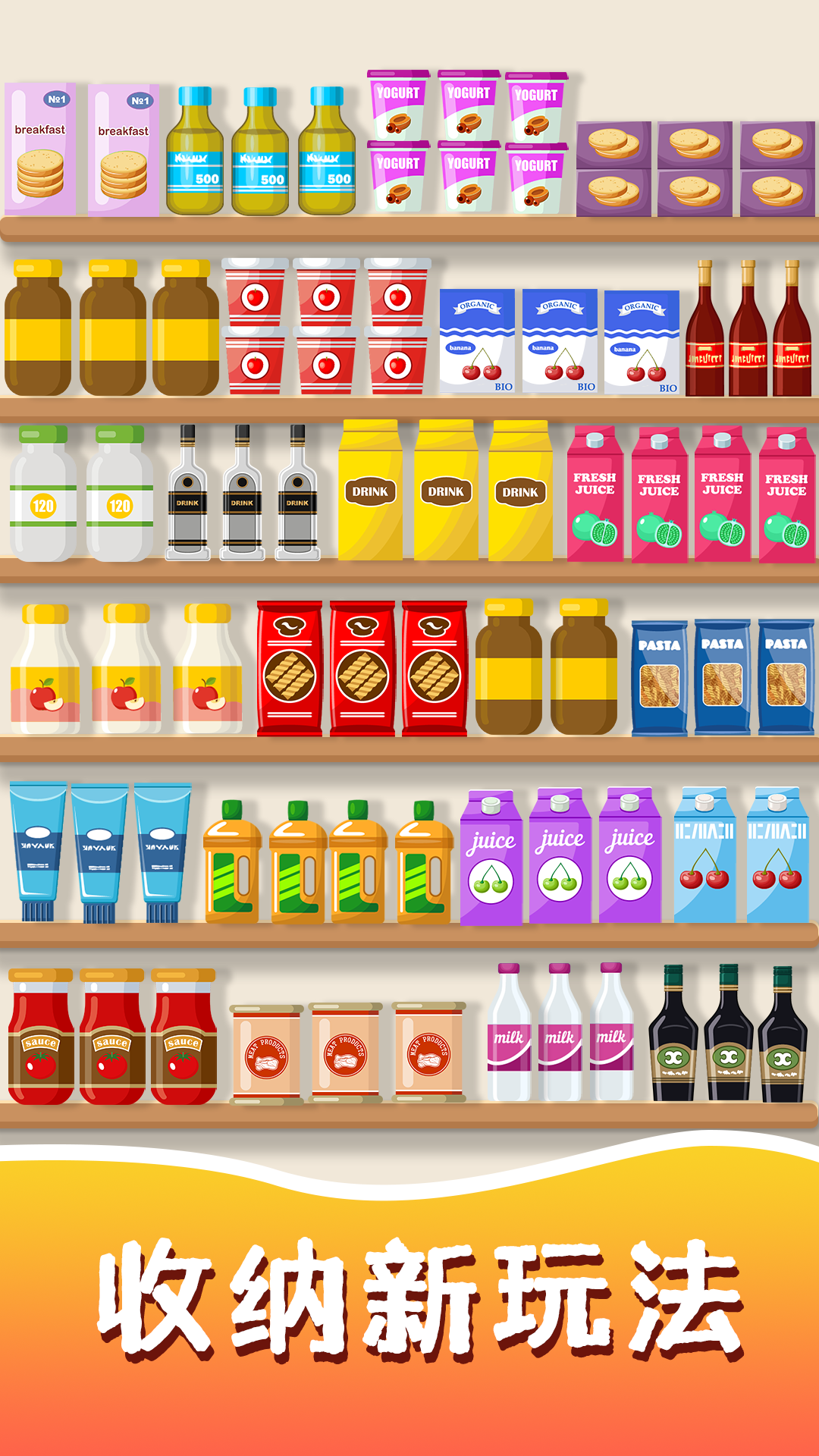 《收纳消消乐》是一款趣味十足的收纳整理类游戏。在游戏里,玩家需要对货柜中的零食、饮料和水果进行分类整理。当把三个相同的物品放置在同一层的时候,就能够实现消除操作,这样一来,就能让杂乱的货柜逐渐变得干净又整齐啦。玩家通过将货物拖动到同一个货架上这种操作,达成闯关任务。