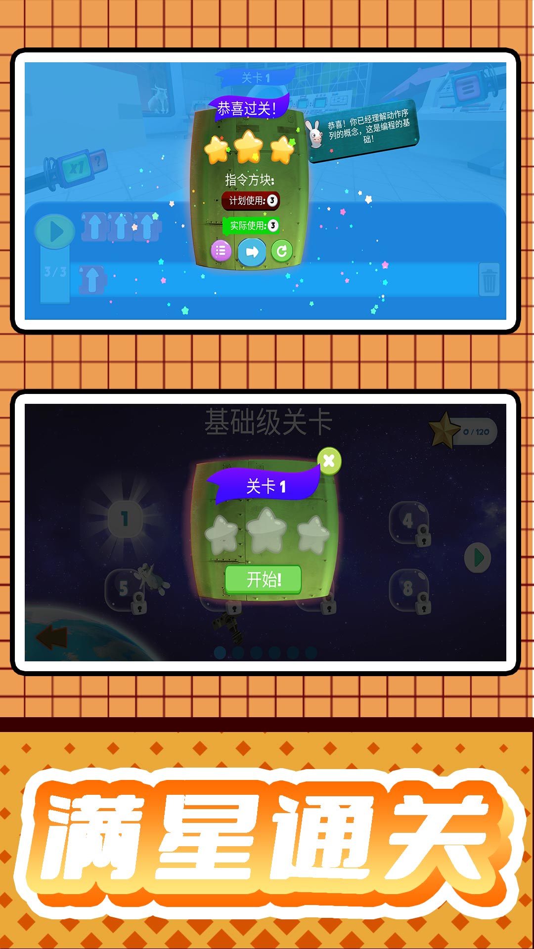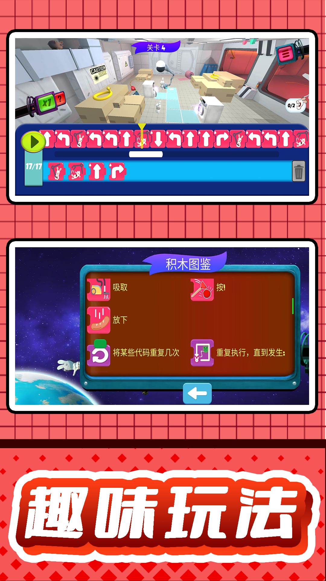为玩家设计了许多充满趣味的编程玩法。游戏的场景被设置在宇宙飞船中,玩家需要给可爱的兔子们输入各种指令,让它们将杂乱的飞船清理干净。游戏的玩法操作很简单,不需要任何编程知识就能快速上手,感兴趣的玩家快来下载吧。
