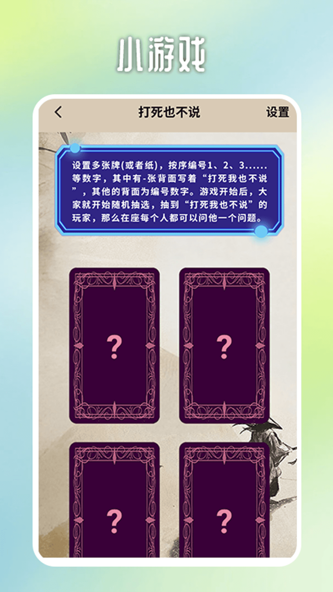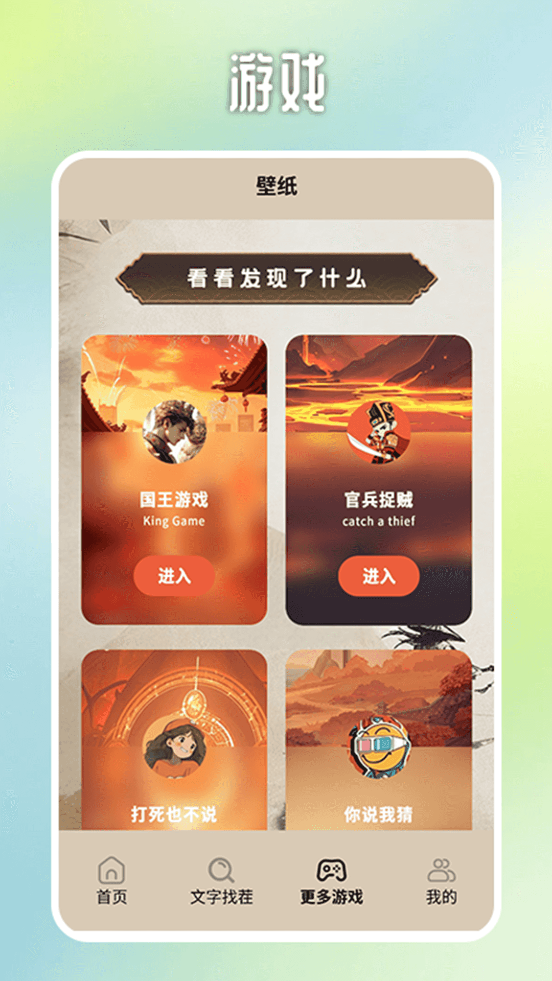 此外,这款软件还涵盖了各种各样的聚会小游戏。在聚会的时候,你是否常常为不知道如何打破僵局而烦恼?又或者在派对上不知道怎样让气氛嗨起来呢?如果是这样的话,那就快来下载这款APP吧!这里的小游戏玩法多种多样,其中运气成分与趣味性都很高,能够让你的聚会充满更多娱乐性和刺激性,为聚会增添不少欢乐氛围呢。